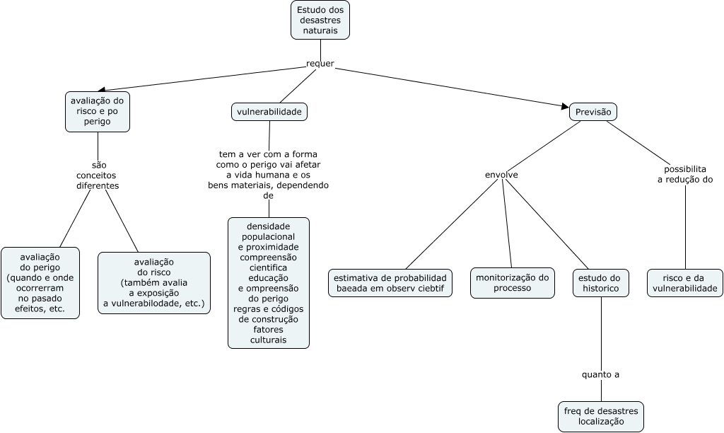 Esse mapa conceitual, produzido no IHMC CmapTools, tem a informação relacionada a: previsão de desastres naturais, avaliação do risco e po perigo são conceitos diferentes avaliação do risco (também avalia a exposição a vulnerabilodade, etc.), Estudo dos desastres naturais requer Previsão, Previsão possibilita a redução do risco e da vulnerabilidade, Estudo dos desastres naturais requer vulnerabilidade, Previsão envolve estudo do historico, estudo do historico quanto a freq de desastres localização, Previsão envolve estimativa de probabilidad baeada em observ ciebtif, avaliação do risco e po perigo são conceitos diferentes avaliação do perigo (quando e onde ocorrerram no pasado efeitos, etc., Previsão envolve monitorização do processo, vulnerabilidade tem a ver com a forma como o perigo vai afetar a vida humana e os bens materiais, dependendo de densidade populacional e proximidade compreensão cientifica educação e ompreensão do perigo regras e códigos de construção fatores culturais, Estudo dos desastres naturais requer avaliação do risco e po perigo