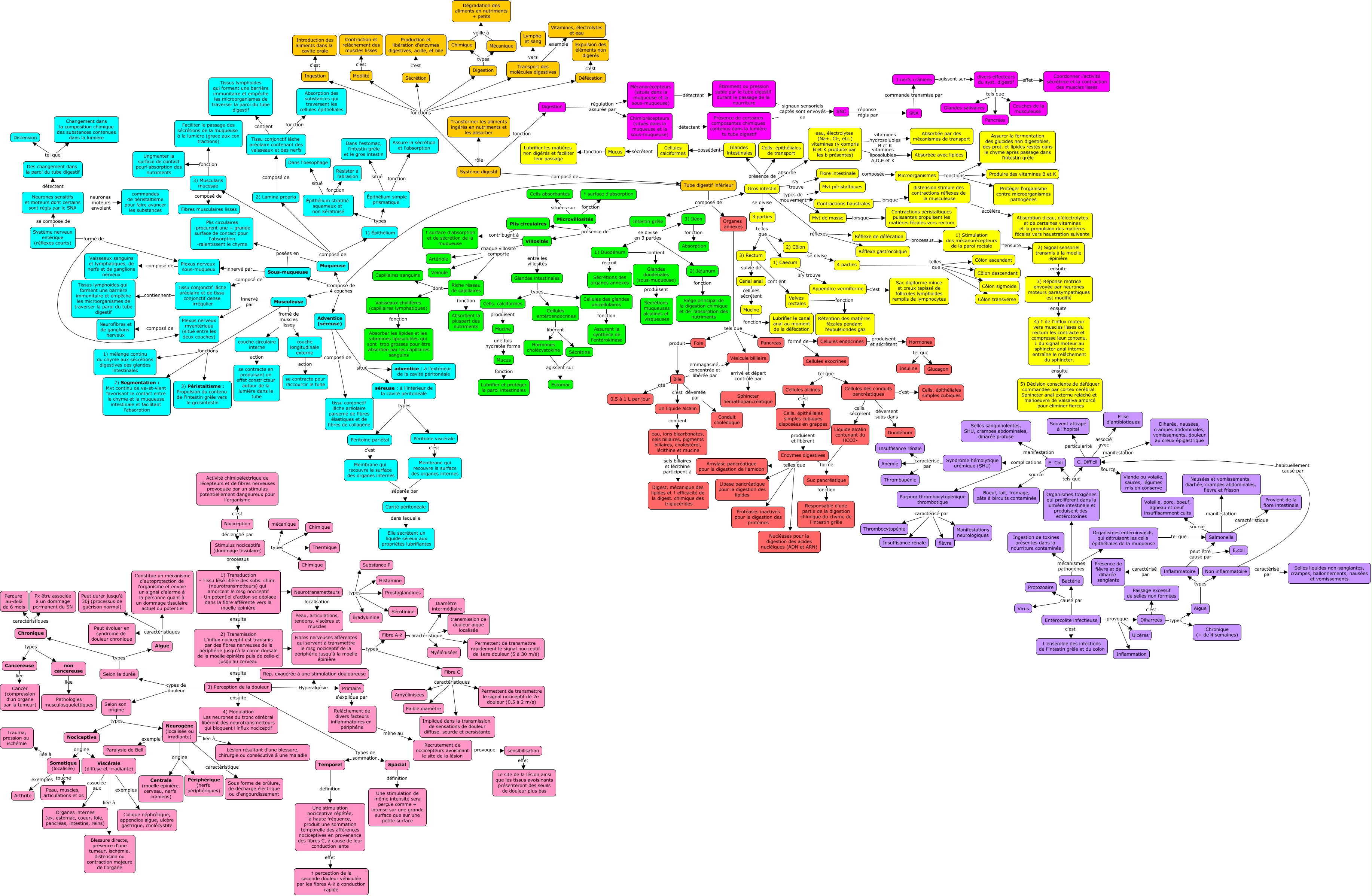 Cette carte de concepts créée avec IHMC CmapTools traite de: Système digestif, Tube digestif inférieur composé de Gros intestin, Nociception c'est Activité chimioélectrique de récepteurs et de fibres nerveuses provoquée par un stimulus potentiellement dangeureux pour l'organisme, Stimulus nociceptifs (dommage tissulaire) types mécanique, Microorganismes fonctions Protéger l'organisme contre microorganismes pathogènes, Sous-muqueuse innervé par Plexus nerveux sous-muqueux, Péritoine pariétal c'est Membrane qui recouvre la surface des organes internes, Entérocolite infectieuse provoque Ulcères, Membrane qui recouvre la surface des organes internes séparés par Carité péritonéale, Nociception déclenché par Stimulus nociceptifs (dommage tissulaire), Organismes entéroinvasifs qui détruisent les cells épithéliales de la muqueuse tel que Salmonella, 3 parties telles que 2) Côlon, Villosités contribuent à ↑ surface d'absorption et de sécrétion de la muqueuse, 3) Muscularis mucosae fonction Faciliter le passage des sécrétions de la muqueuse à la lumière (grace aux con tractions), 1) Duodénum reçcoit Sécrétions des organes annexes, Mécanique veille à Dégradation des aliments en nutriments + petits, Digestion régulation assurée par Chimiorécepteurs (situés dans la muqueuse et la sous-muqueuse), Glandes duodénales (sous-muqueuse) produisent Sécrétions muqueuses alcalines et visqueuses, Purpura thrombocytopénique thrombotique caractérisé par Manifestations neurologiques, Vaisseaux chylifères (capillaires lymphatiques) fonction Absorber les lipides et les vitamines liposolubles qui sont trop grosses pour être absorbée par les capillaires sanguins, C. Difficil particularité Souvent attrapé à l'hopital