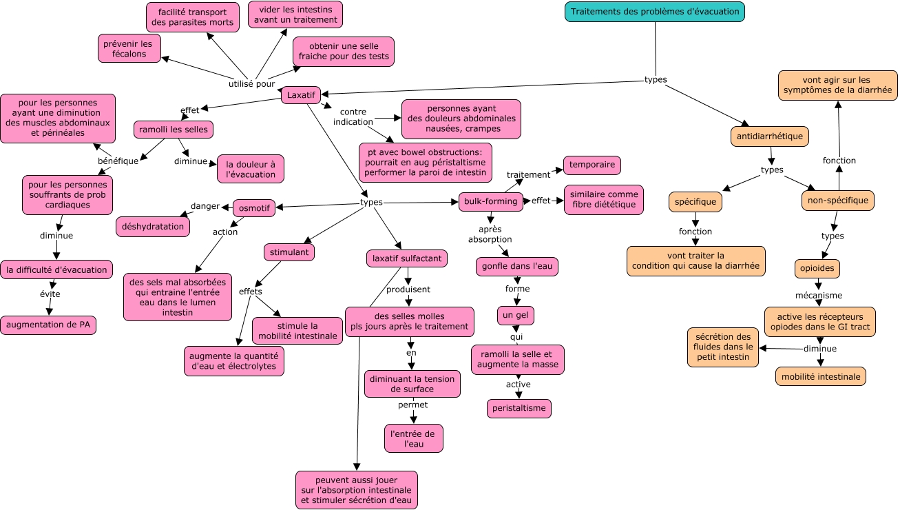 This Concept Map, created with IHMC CmapTools, has information related to: traitement prob défécation, non-spécifique fonction vont agir sur les symptômes de la diarrhée, ramolli la selle et augmente la masse active peristaltisme, Laxatif contre indication personnes ayant des douleurs abdominales nausées, crampes, Laxatif utilisé pour vider les intestins avant un traitement, Laxatif contre indication pt avec bowel obstructions: pourrait en aug péristaltisme performer la paroi de intestin, Laxatif utilisé pour prévenir les fécalons, des selles molles pls jours après le traitement en diminuant la tension de surface, Laxatif types osmotif, Laxatif utilisé pour facilité transport des parasites morts, active les récepteurs opiodes dans le GI tract diminue sécrétion des fluides dans le petit intestin, spécifique fonction vont traiter la condition qui cause la diarrhée, pour les personnes souffrants de prob cardiaques diminue la difficulté d'évacuation, ramolli les selles bénéfique pour les personnes souffrants de prob cardiaques, Laxatif effet ramolli les selles, osmotif action des sels mal absorbées qui entraine l'entrée eau dans le lumen intestin, gonfle dans l'eau forme un gel, opioides mécanisme active les récepteurs opiodes dans le GI tract, Laxatif types bulk-forming, ramolli les selles bénéfique pour les personnes ayant une diminution des muscles abdominaux et périnéales, Traitements des problèmes d'évacuation types Laxatif