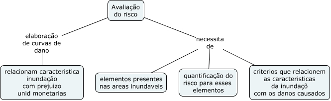 Esse mapa conceitual, produzido no IHMC CmapTools, tem a informação relacionada a: avaliação_1, Avaliação do risco necessita de elementos presentes nas areas inundaveis, Avaliação do risco elaboração de curvas de dano relacionam caracteristica inundação com prejuizo unid monetarias, Avaliação do risco necessita de criterios que relacionem as caracteristicas da inundaçõ com os danos causados, Avaliação do risco necessita de quantificação do risco para esses elementos