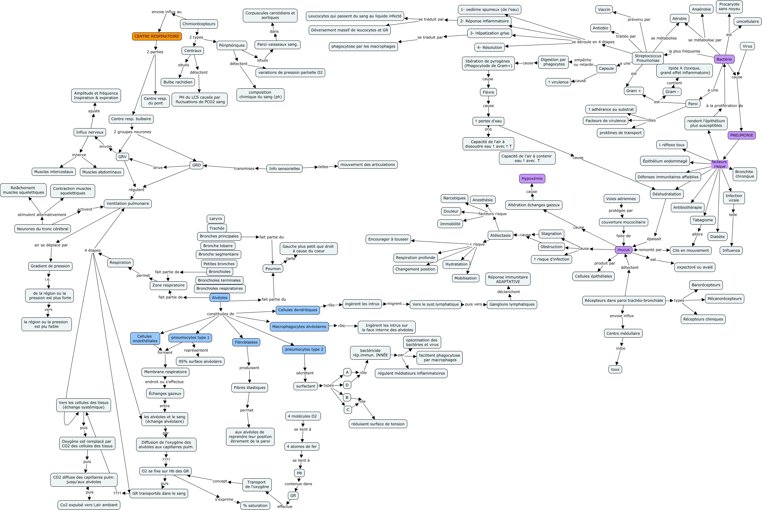 Cette carte de concepts créée avec IHMC CmapTools traite de: Nadine - Bactéries et immunité, Alvéoles fait partie de Zone respiratoire, Bactérie est Procaryote sans noyau, ingèrent les intrus migrent Vers le syst.lymphatique, Atélectasie ↓ risque Changement position, Chimiorécepteurs 2 types Périphériques, Tabagisme altère Cils en mouvement, Influx nerveux innerve Muscles intercostaux, ↑ pertes d'eau pcq Capacité de l'air à dissoudre eau ↑ avec ↑ T, Alvéoles constituées de pneumocytes type 2, mucus cause Altération échanges gazeux, Alvéoles fait partie du Poumon, de la région ou la pression est plus forte vers la région ou la pression est plu faible, Infection virale telle Influenza, mucus remonté par Cils en mouvement, Gram - contient lipide A (toxique, grand effet inflammatoire), Bactérie cause PNEUMONIE, Bronches principales fait partie du Poumon, GRD régulent Ventilation pulmonaire, Alvéoles constituées de Macrophagocytes alvéolaires, bactéricide rép.immun. INNÉE par opsonisation des bactéries et virus