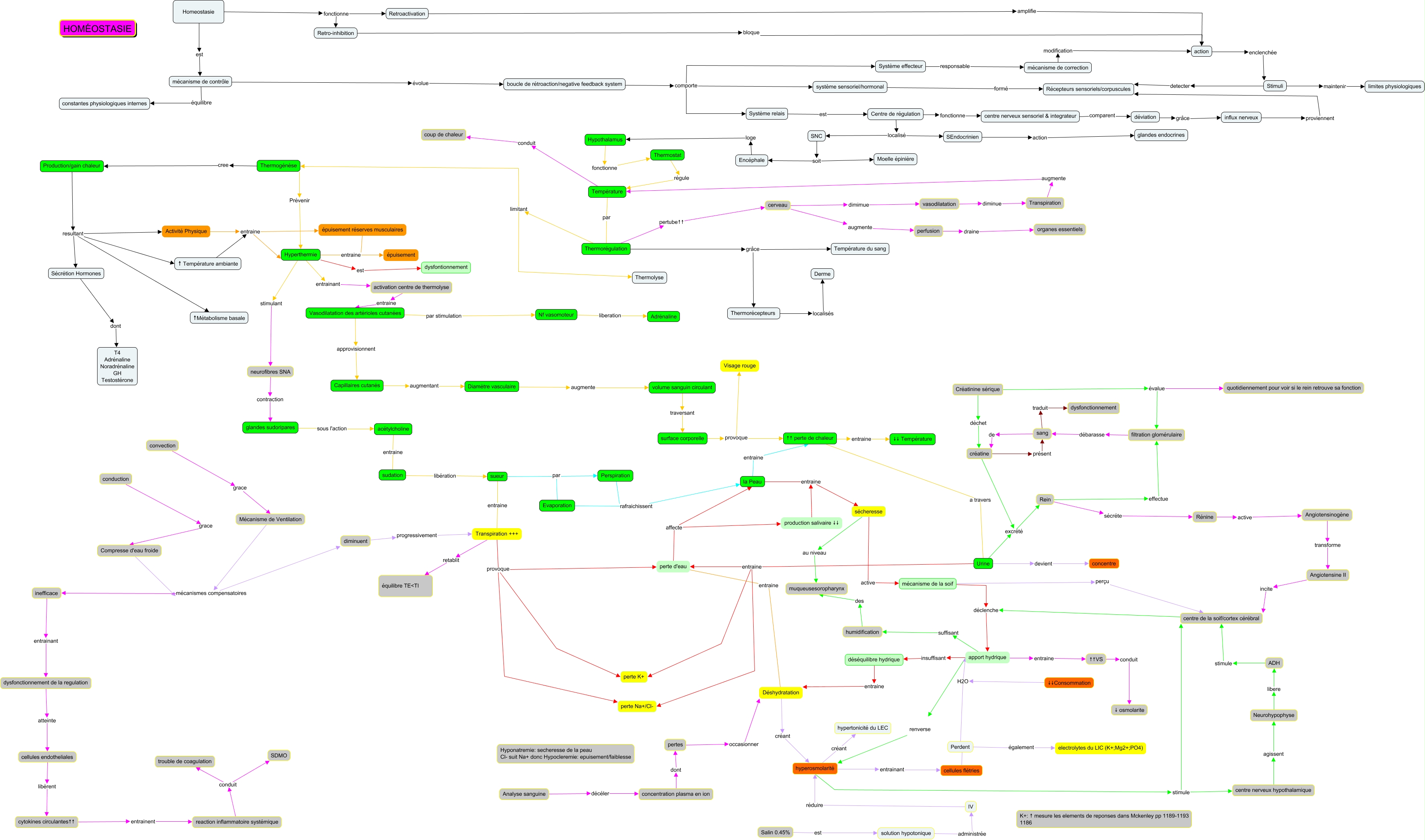 Cette carte de concepts créée avec IHMC CmapTools traite de: Homéostasie référence d'un autre groupe, Thermorégulation pertube↑↑ cerveau, surface corporelle provoque ↑↑ perte de chaleur, hyperosmolarité entrainant cellules flétries, Compresse d'eau froide mécanismes compensatoires inefficace, solution hypotonique administrée IV, diminuent progressivement Transpiration +++, créatine excrété Rein, sueur par Perspiration, centre nerveux hypothalamique agissent Neurohypophyse, Homeostasie fonctionne Retroactivation, vasodilatation diminue Transpiration, Hyperthermie est dysfontionnement, action enclenchée Stimuli, Urine excrété Rein, Analyse sanguine décéler concentration plasma en ion, pertes occasionner Déshydratation, Perspiration rafraichissent la Peau, Hyperthermie entrainant activation centre de thermolyse, perte d'eau affecte production salivaire ↓↓, Transpiration +++ provoque perte Na+/Cl-