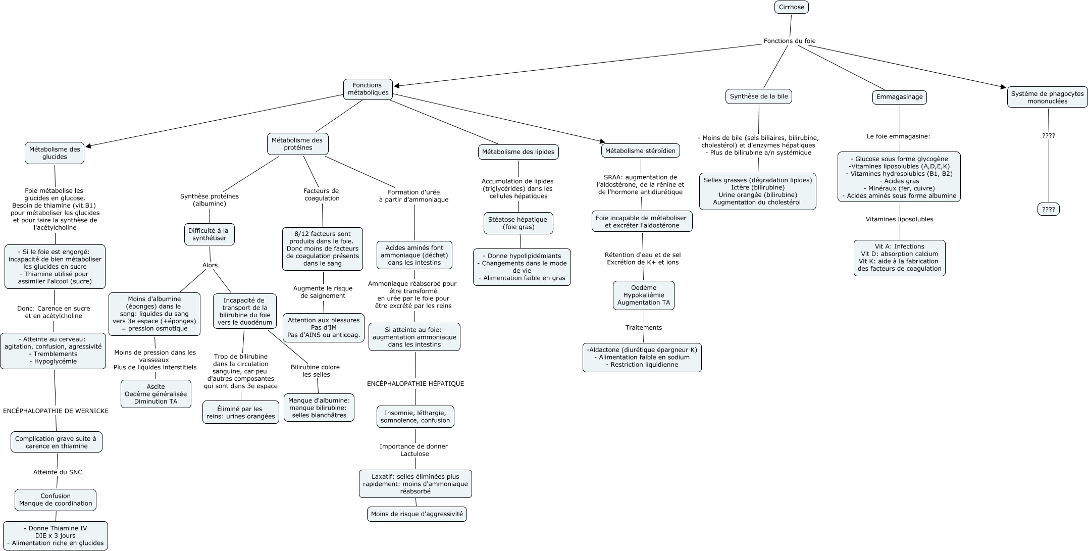 Cette carte de concepts créée avec IHMC CmapTools traite de: Cirrhose, Laxatif: selles éliminées plus rapidement: moins d'ammoniaque réabsorbé ???? Moins de risque d'aggressivité, Cirrhose Fonctions du foie Système de phagocytes mononuclées, Difficulté à la synthétiser Alors Moins d'albumine (éponges) dans le sang: liquides du sang vers 3e espace (+éponges) = pression osmotique, Métabolisme des protéines Synthèse protéines (albumine) Difficulté à la synthétiser, Fonctions métaboliques ???? Métabolisme des protéines, Foie incapable de métaboliser et excréter l'aldostérone Rétention d'eau et de sel Excrétion de K+ et ions Oedème Hypokaliémie Augmentation TA, Cirrhose Fonctions du foie Fonctions métaboliques, 8/12 facteurs sont produits dans le foie. Donc moins de facteurs de coagulation présents dans le sang Augmente le risque de saignement Attention aux blessures Pas d'IM Pas d'AINS ou anticoag., Métabolisme des protéines Facteurs de coagulation 8/12 facteurs sont produits dans le foie. Donc moins de facteurs de coagulation présents dans le sang, Moins d'albumine (éponges) dans le sang: liquides du sang vers 3e espace (+éponges) = pression osmotique Moins de pression dans les vaisseaux Plus de liquides interstitiels Ascite Oedème généralisée Diminution TA, Difficulté à la synthétiser Alors Incapacité de transport de la bilirubine du foie vers le duodénum, Métabolisme des glucides Foie métabolise les glucides en glucose. Besoin de thiamine (vit.B1) pour métaboliser les glucides et pour faire la synthèse de l'acétylcholine - Si le foie est engorgé: incapacité de bien métaboliser les glucides en sucre - Thiamine utilisé pour assimiler l'alcool (sucre), Métabolisme des lipides Accumulation de lipides (triglycérides) dans les cellules hépatiques Stéatose hépatique (foie gras), Acides aminés font ammoniaque (déchet) dans les intestins Ammoniaque réabsorbé pour être transformé en urée par le foie pour être excrété par les reins Si atteinte au foie: augmentation ammoniaque dans les intestins, Insomnie, léthargie, somnolence, confusion Importance de donner Lactulose Laxatif: selles éliminées plus rapidement: moins d'ammoniaque réabsorbé, Confusion Manque de coordination Donne thiamine IV DIE x 3jours - Donne Thiamine IV DIE x 3 jours - Alimentation riche en glucides, - Si le foie est engorgé: incapacité de bien métaboliser les glucides en sucre - Thiamine utilisé pour assimiler l'alcool (sucre) Donc: Carence en sucre et en acétylcholine - Atteinte au cerveau: agitation, confusion, agressivité - Tremblements - Hypoglycémie, Incapacité de transport de la bilirubine du foie vers le duodénum Bilirubine colore les selles Manque d'albumine: manque bilirubine: selles blanchâtres, Fonctions métaboliques ???? Métabolisme des glucides, Métabolisme stéroïdien SRAA: augmentation de l'aldostérone, de la rénine et de l'hormone antidiurétique Foie incapable de métaboliser et excréter l'aldostérone
