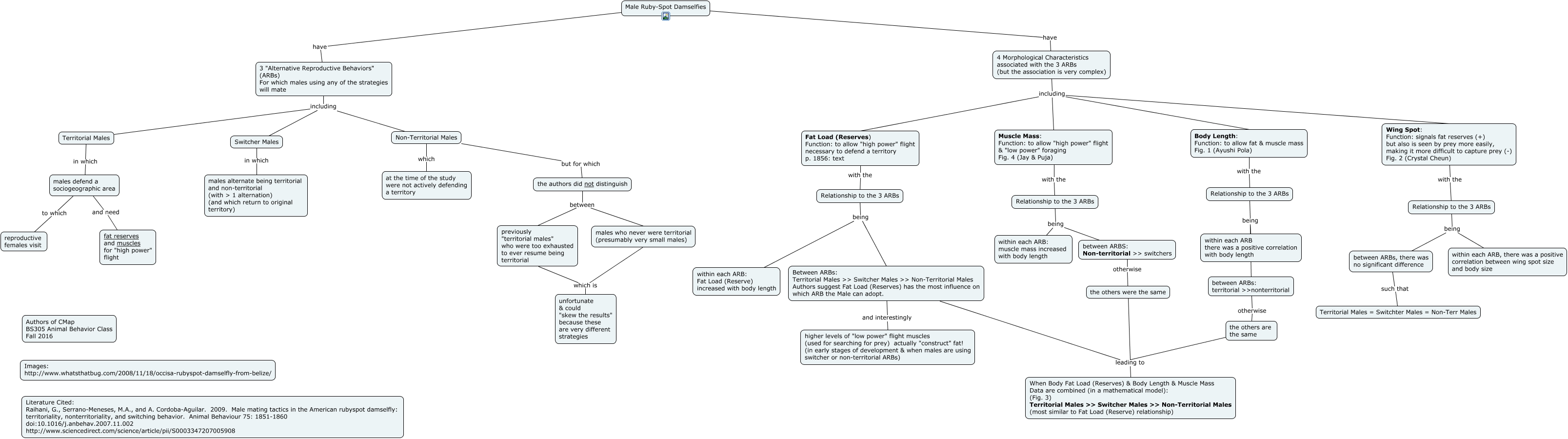This Concept Map, created with IHMC CmapTools, has information related to: Ruby Spot Damselfly Territoriality, between ARBs, there was no significant difference such that Territorial Males = Switchter Males = Non-Terr Males, the others are the same leading to When Body Fat Load (Reserves) & Body Length & Muscle Mass Data are combined (in a mathematical model): (Fig. 3) Territorial Males >> Switcher Males >> Non-Territorial Males (most similar to Fat Load (Reserve) relationship), Switcher Males in which males alternate being territorial and non-territorial (with > 1 alternation) (and which return to original territory), males defend a sociogeographic area to which reproductive females visit, the authors did not distinguish between males who never were territorial (presumably very small males), males who never were territorial (presumably very small males) which is unfortunate & could "skew the results" because these are very different strategies, the others were the same leading to When Body Fat Load (Reserves) & Body Length & Muscle Mass Data are combined (in a mathematical model): (Fig. 3) Territorial Males >> Switcher Males >> Non-Territorial Males (most similar to Fat Load (Reserve) relationship), 3 "Alternative Reproductive Behaviors" (ARBs) For which males using any of the strategies will mate including Switcher Males, Relationship to the 3 ARBs being between ARBs, there was no significant difference, 4 Morphological Characteristics associated with the 3 ARBs (but the association is very complex) including Muscle Mass: Function: to allow "high power" flight & "low power" foraging Fig. 4 (Jay & Puja), Wing Spot: Function: signals fat reserves (+) but also is seen by prey more easily, making it more difficult to capture prey (-) Fig. 2 (Crystal Cheun) with the Relationship to the 3 ARBs, 4 Morphological Characteristics associated with the 3 ARBs (but the association is very complex) including Fat Load (Reserves) Function: to allow "high power" flight necessary to defend a territory p. 1856: text, Non-Territorial Males but for which the authors did not distinguish, Between ARBs: Territorial Males >> Switcher Males >> Non-Territorial Males Authors suggest Fat Load (Reserves) has the most influence on which ARB the Male can adopt. leading to When Body Fat Load (Reserves) & Body Length & Muscle Mass Data are combined (in a mathematical model): (Fig. 3) Territorial Males >> Switcher Males >> Non-Territorial Males (most similar to Fat Load (Reserve) relationship), Relationship to the 3 ARBs being within each ARB: muscle mass increased with body length, Muscle Mass: Function: to allow "high power" flight & "low power" foraging Fig. 4 (Jay & Puja) with the Relationship to the 3 ARBs, Body Length: Function: to allow fat & muscle mass Fig. 1 (Ayushi Pola) with the Relationship to the 3 ARBs, Relationship to the 3 ARBs being between ARBS: Non-territorial >> switchers, Male Ruby-Spot Damselfies have 4 Morphological Characteristics associated with the 3 ARBs (but the association is very complex), Relationship to the 3 ARBs being within each ARB: Fat Load (Reserve) increased with body length