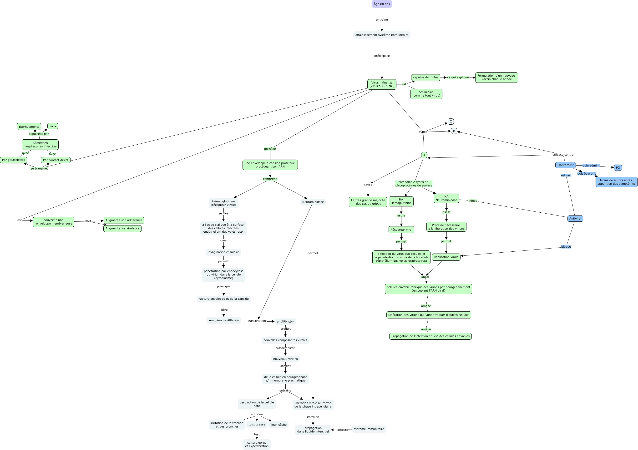 This Concept Map, created with IHMC CmapTools, has information related to: Nadine Immunité (Virus influenza), Libération des virions qui vont attaquer d'autres cellules amène Propagation de l'infection et lyse des cellules envahies, Âge 88 ans entraîne affaiblissement système immunitaire, Récepteur viral permet la fixation du virus aux cellules et la pénétration du virus dans la cellule (épithélium des voies respiratoires), Oseltamivir voie admin. PO, Réplication virale cause cellules envahie fabrique des virions par bourgeonnement (en copiant l'ARN viral), invagination cellulaire permet pénétration par endocytose du virion dans la cellule (cytoplasme), Sécrétions respiratoires infectées expulsées par Toux, libération virale au terme de la phase intracellulaire entraîne propagation dans liquide intersitiel, Oseltamivir doit être pris Moins de 48 hrs après apparition des symptômes, capable de muter ce qui explique Formulation d'un nouveau vaccin chaque année, couvert d'une enveloppe membraneuse effet Augmente son adhérance, rupture enveloppe et de la capside libère son génome ARN sb-, HA Hémaglutinine est le Récepteur viral, Protéine nécessaire à la libération des virions permet Réplication virale, Sécrétions respiratoires infectées avec Par contact direct, toux grasse test culture gorge et expectoration, couvert d'une enveloppe membraneuse effet Augmente sa virulence, Virus influenza (virus à ARN sb-) types B, la fixation du virus aux cellules et la pénétration du virus dans la cellule (épithélium des voies respiratoires) cause cellules envahie fabrique des virions par bourgeonnement (en copiant l'ARN viral), nouveaux virions sortent de la cellule en bourgeonnant a/n membrane plasmatique