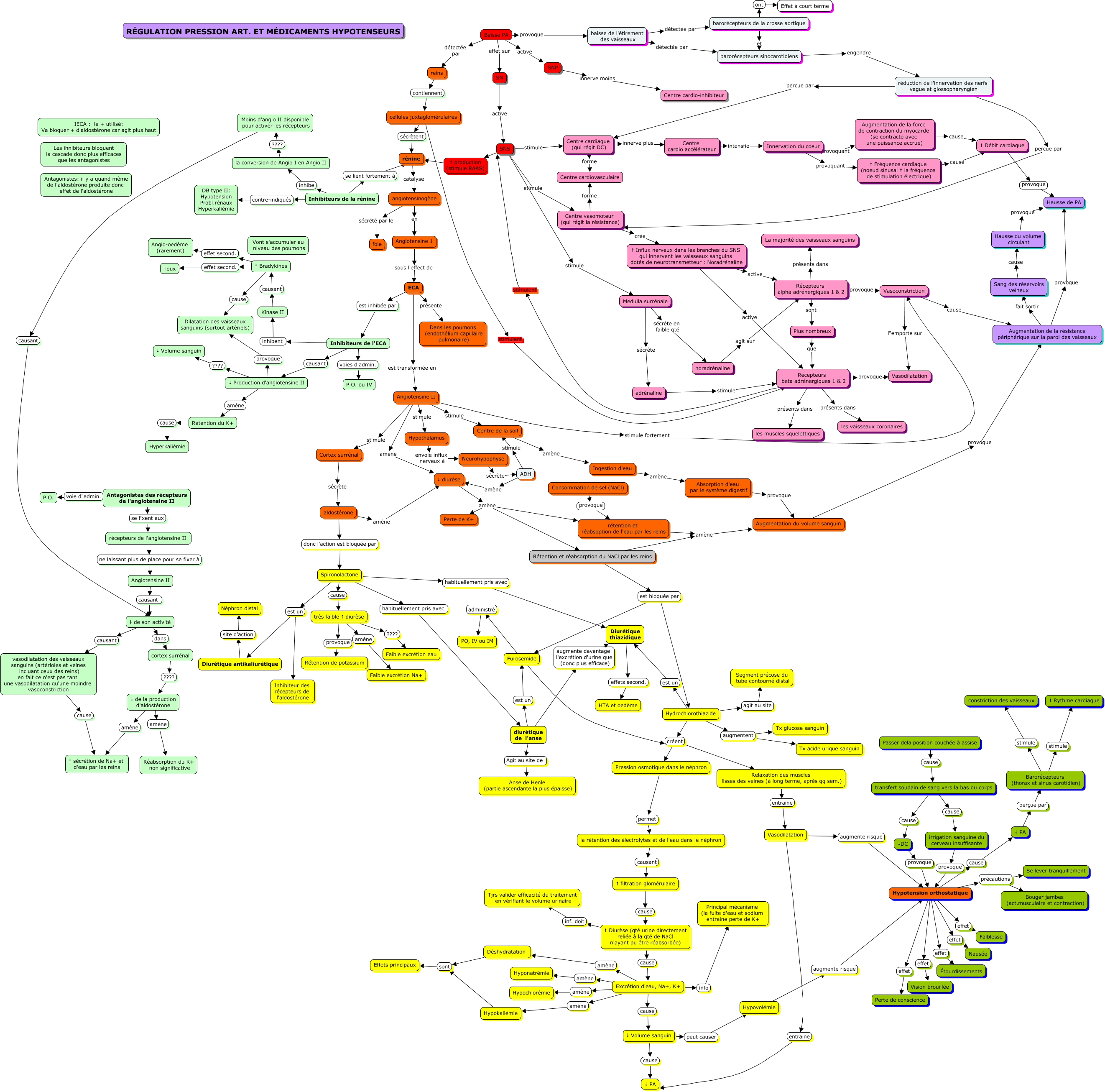 Cette carte de concepts créée avec IHMC CmapTools traite de: Nadine Régulation PA+meds, Centre vasomoteur (qui régit la résistance) forme Centre cardiovasculaire, Angiotensine II causant ↓ de son activité, Angiotensine II stimule fortement Vasoconstriction, Récepteurs beta adrénergiques 1 & 2 présents dans les muscles squelettiques, Récepteurs alpha adrénergiques 1 & 2 présents dans La majorité des vaisseaux sanguins, Spironolactone est un Inhibiteur des récepteurs de l'aldostérone, Hydrochlorothiazide est un Diurétique thiazidique, adrénaline stimule Récepteurs beta adrénergiques 1 & 2, cortex surrénal ???? ↓ de la production d'aldostérone, Centre de la soif amène Ingestion d'eau, Hypotension orthostatique cause ↓ PA, Kinase II causant ↑ Bradykines, Medulla surrénale sécrète adrénaline, noradrénaline agit sur Récepteurs alpha adrénergiques 1 & 2, reins contiennent cellules juxtaglomérulaires, ↑ Fréquence cardiaque (noeud sinusal ↑ la fréquence de stimulation électrique) cause ↑ Débit cardiaque, Barorécepteurs (thorax et sinus carotidien) stimule ↑ Rythme cardiaque, Angiotensine II stimule Cortex surrénal, Excrétion d'eau, Na+, K+ amène Hypochlorémie, Inhibiteurs de la rénine inhibe la conversion de Angio I en Angio II