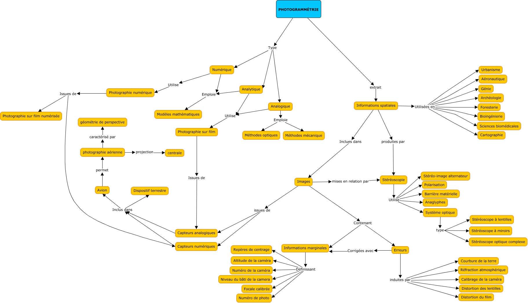 Cette carte de concepts créée avec IHMC CmapTools traite de: Photogrammétrie, Stéréoscopie Utilise Anaglyphes, Informations spatiales Utilisées en Cartographie, Erreurs induites par Courbure de la terre, Erreurs Corrigées avec Informations marginales, Stéréoscopie Utilise Barrière matérielle, Capteurs numériques Inclus dans Dispositif terrestre, Capteurs analogiques Inclus dans Dispositif terrestre, Stéréoscopie Utilise Polarisation, Stéréoscopie Utilise Système optique, Système optique type Stéréoscope à miroirs, PHOTOGRAMMÉTRIE extrait Informations spatiales, Capteurs analogiques Inclus dans Avion, Informations marginales Définissant Focale calibrée, Analytique Utilise Photographie sur film, Numérique Emploie Modèles mathématiques, Photographie numérique Issues de Photographie sur film numérisée, Informations spatiales Utilisées en Aéronautique, Informations marginales Définissant Altitude de la caméra, PHOTOGRAMMÉTRIE Type Analytique, Informations spatiales Utilisées en Sciences biomédicales