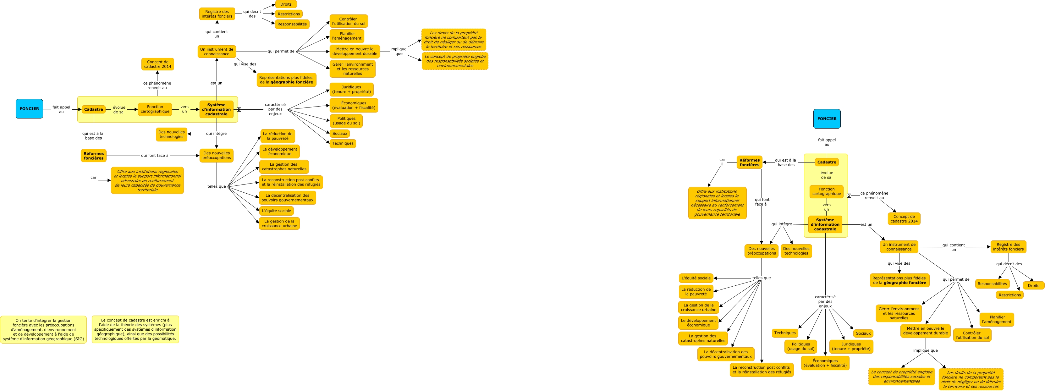 This Concept Map, created with IHMC CmapTools, has information related to: Foncier, Cadastre évolue de sa Fonction cartographique, Mettre en oeuvre le développement durable implique que Le concept de propriété englobe des responsabilités sociales et environnementales, Registre des intérêts fonciers qui décrit des Restrictions, Un instrument de connaissance qui permet de Gérer l'environnment et les ressources naturelles, Système d'information cadastrale qui intègre Des nouvelles technologies, Un instrument de connaissance qui permet de Mettre en oeuvre le développement durable, Réformes foncières car il Offre aux institutions régionales et locales le support informationnel nécessaire au renforcement de leurs capacités de gouvernance territoriale, Un instrument de connaissance qui permet de Planifier l'aménagement, Mettre en oeuvre le développement durable implique que Les droits de la propriété foncière ne comportent pas le droit de négliger ou de détruire le territoire et ses ressources, Système d'information cadastrale caractérisé par des enjeux Sociaux, Des nouvelles préoccupations telles que Le développement économique, Un instrument de connaissance qui permet de Planifier l'aménagement, Des nouvelles préoccupations telles que L'équité sociale, Système d'information cadastrale caractérisé par des enjeux Techniques, Des nouvelles préoccupations telles que La reconstruction post conflits et la réinstallation des réfugiés, Des nouvelles préoccupations telles que La réduction de la pauvreté, ???? ce phénomène renvoit au Concept de cadastre 2014, Registre des intérêts fonciers qui décrit des Restrictions, Mettre en oeuvre le développement durable implique que Les droits de la propriété foncière ne comportent pas le droit de négliger ou de détruire le territoire et ses ressources, Des nouvelles préoccupations telles que La gestion des catastrophes naturelles