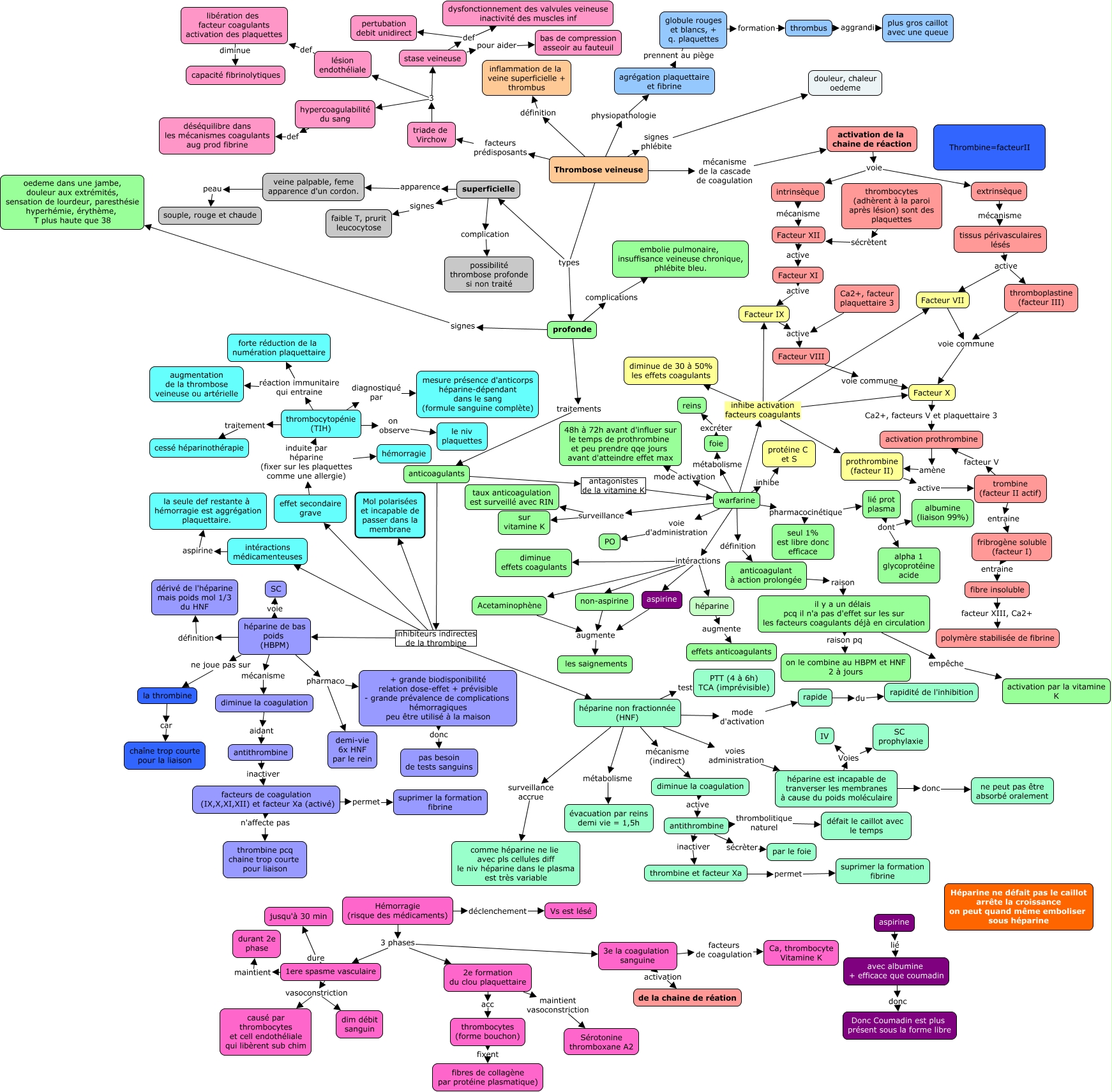 Cette carte de concepts créée avec IHMC CmapTools traite de: Clara thrombose veineuse2, 1ere spasme vasculaire dure jusqu'à 30 min, Thrombose veineuse physiopathologie agrégation plaquettaire et fibrine, antithrombine inactiver thrombine et facteur Xa, globule rouges et blancs, + q. plaquettes formation thrombus, 3e la coagulation sanguine activation de la chaine de réation, activation prothrombine amène prothrombine (facteur II), anticoagulants antagonistes de la vitamine K warfarine, warfarine pharmacocinétique seul 1% est libre donc efficace, Acetaminophène augmente les saignements, thrombocytopénie (TIH) réaction immunitaire qui entraine forte réduction de la numération plaquettaire, héparine de bas poids (HBPM) pharmaco + grande biodisponibilité relation dose-effet + prévisible - grande prévalence de complications hémorragiques peu être utilisé à la maison, veine palpable, feme apparence d'un cordon. peau souple, rouge et chaude, warfarine voie d'administration PO, héparine est incapable de tranverser les membranes à cause du poids moléculaire donc ne peut pas être absorbé oralement, thromboplastine (facteur III) voie commune Facteur X, héparine non fractionnée (HNF) métabolisme évacuation par reins demi vie = 1,5h, Thrombose veineuse types profonde, warfarine intéractions aspirine, héparine non fractionnée (HNF) voies administration héparine est incapable de tranverser les membranes à cause du poids moléculaire, héparine non fractionnée (HNF) mode d'activation rapide