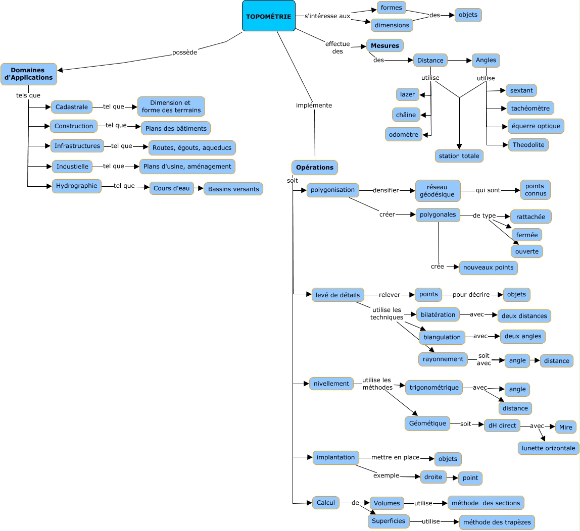 Cette carte de concepts créée avec IHMC CmapTools traite de: Topometrie, rayonnement soit avec angle, Construction tel que Plans des bâtiments, levé de détails utilise les techniques rayonnement, Mesures des Angles, levé de détails utilise les techniques biangulation, TOPOMÉTRIE s'intéresse aux formes, biangulation avec deux angles, polygonales de type ouverte, Mesures des Distance, Géométique soit dH direct, dimensions des objets, Angles utilise équerre optique, polygonales crée nouveaux points, Hydrographie tel que Cours d'eau, Angles utilise tachéomètre, Infrastructures tel que Routes, égouts, aqueducs, implantation mettre en place objets, dH direct avec Mire, Domaines d'Applications tels que Industielle, TOPOMÉTRIE effectue des Mesures