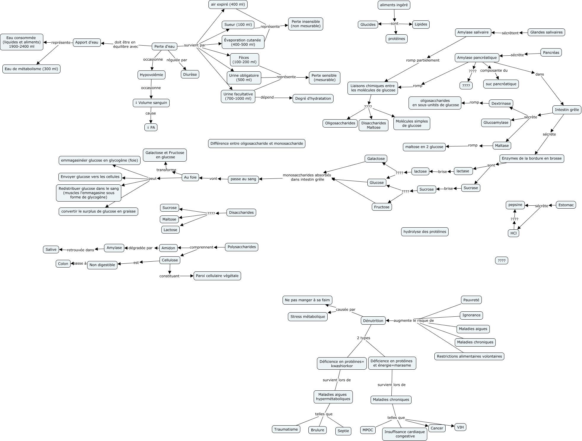 Cette carte de concepts créée avec IHMC CmapTools traite de: Digestion, Amylase pancréatique dans Intestin grêle, Perte d'eau survient par air expiré (400 ml), Liaisons chimiques entre les molécules de glucose ???? Oligosaccharides, Amylase salivaire romp partièlement Liaisons chimiques entre les molécules de glucose, HCl ???? pepsine, Amylase pancréatique composante du suc pancréatique, Cellulose constituant Paroi cellulaire végétale, Urine obligatoire (500 ml) représente Perte sensible (mesurable), Perte d'eau occasionne Hypovolémie, Maladies aigues augmente le risque de Dénutrition, Fèces (100-200 ml) représente Urine facultative (700-1000 ml), Sucrose ???? Fructose, aliments ingéré sont Lipides, Au foie peut emmagasinéer glucose en glycogène (foie), air expiré (400 ml) représente Évaporation cutanée (400-500 ml), Perte d'eau survient par Urine facultative (700-1000 ml), Liaisons chimiques entre les molécules de glucose ???? Disaccharides Maltose, Dénutrition causée par Ne pas manger à sa faim, Amylase retrouvée dans Salive, Apport d'eau représente Eau consommée (liquides et aliments) 1900-2400 ml