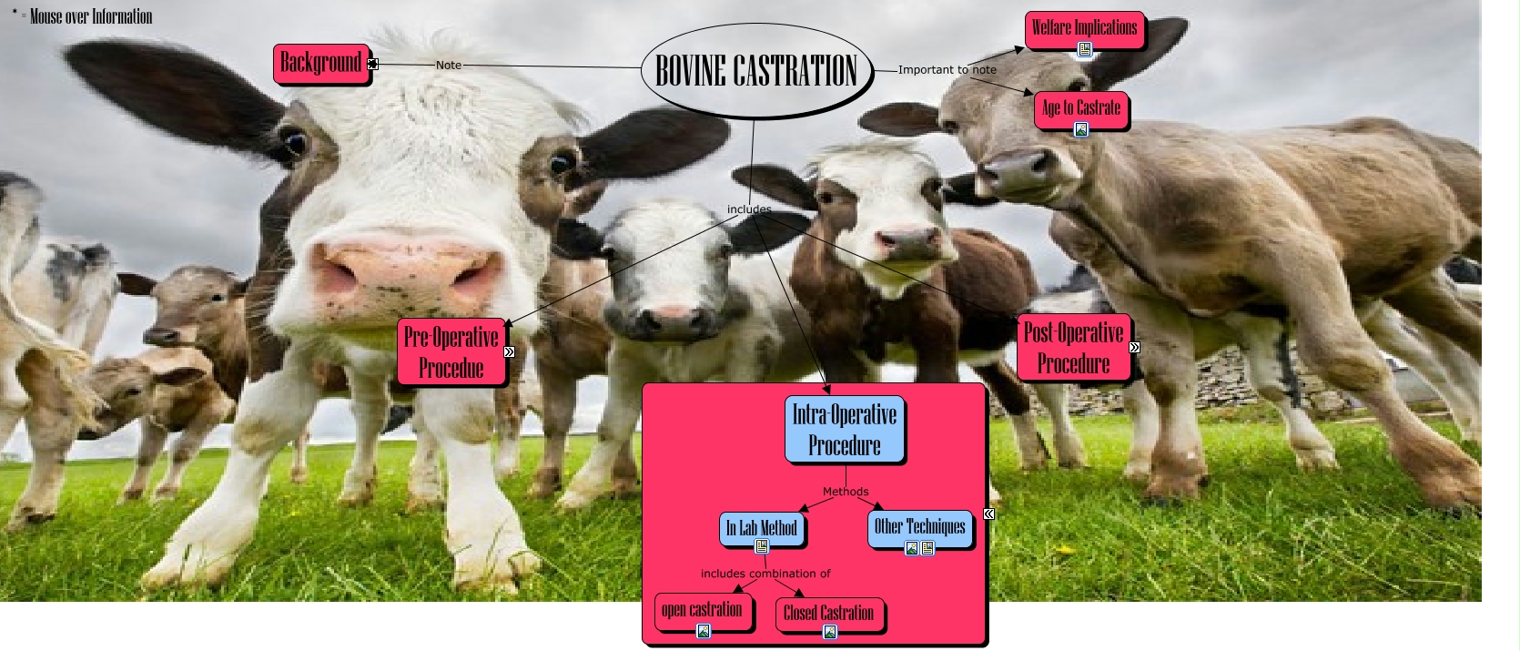 This Concept Map, created with IHMC CmapTools, has information related to: Lab 9, Physical Exam examination of Temperature Heart Rate Respiratory Rate, Background includes Advantages, Physical Exam examination of Scrotum, Post-Operative Procedure includes After Care*, In Lab Method includes combination of open castration, RESTRAINT involves rope*, BOVINE CASTRATION Note Background, Pre-Operative Procedure involves Drugs & Anaesthesia, Pre-Operative Procedure involves Physical Exam, Background includes Disadvantages, Pre-Operative Procedure involves RESTRAINT, Post-Operative Procedure includes Possible Complications, BOVINE CASTRATION Important to note Age to Castrate, BOVINE CASTRATION includes Intra-Operative Procedure, BOVINE CASTRATION Important to note Welfare Implications, RESTRAINT involves manual, Pre-Operative Procedure involves ASA Grade*, BOVINE CASTRATION includes Post-Operative Procedure, Background includes Anatomy, In Lab Method includes combination of Closed Castration
