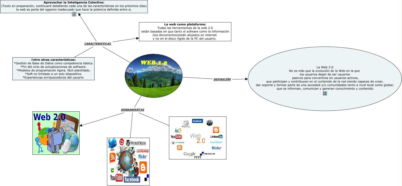 Este Cmap, tiene información relacionada con: cmap, WEB 2.0 CARACTERISTICAS Entre otras caracteristicas: *Gestión de Base de Datos como competencia básica. *Fin del ciclo de actualizaciones de software. *Modelos de programación ligera, fácil plantillado. *Soft no limitado a un solo dispositivo. *Experiencias enriquecedoras del usuario, WEB 2.0 CARACTERISTICAS La web como plataforma: Todas las herramientas de la web 2.0 están basadas en que tanto el sofware como la información (los documentos)están alojados en internet y no en el disco rígido de la PC del usuario., WEB 2.0 HERRAMIENTAS ????, WEB 2.0 HERRAMIENTAS ????, WEB 2.0 DEFINICIÓN La Web 2.0 No es más que la evolución de la Web en la que los usuarios dejan de ser usuarios pasivos para convertirse en usuarios activos, que participan y contribuyen en el contenido de la red siendo capaces de crear, dar soporte y formar parte de una sociedad y/o comunidades tanto a nivel local como global; que se informan, comunican y generan conocimiento y contenido., WEB 2.0 CARACTERISTICAS Aprovechar la Inteligencia Colectiva: (Texto en preparación, continuaré detallando cada una de las características en los próximos días) la web es parte del ogasmo inadecuado que hace la potencia definida entre si., WEB 2.0 HERRAMIENTAS