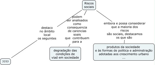 Esse mapa conceitual, produzido no IHMC CmapTools, tem a informação relacionada a: riscos sociais 2, Riscos sociais destaco no âmbito local os seguintes ????, Riscos sociais podem ser analisados como consequencia de carencias soais que contribuem para a degradação das condições de viad em sociedade, Riscos sociais embora e possa conseiderar que a maioria dos riscos são sociais, destacamos os que são produtos da sociedade e às formas de politica e adminstração adotadas aos crescimento urbano ...