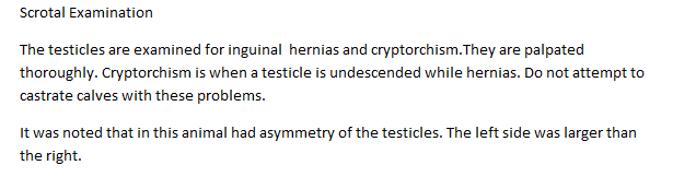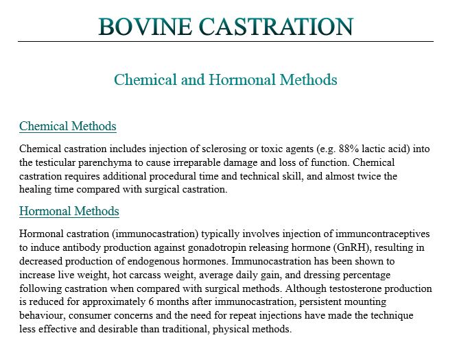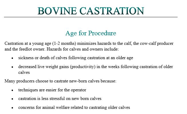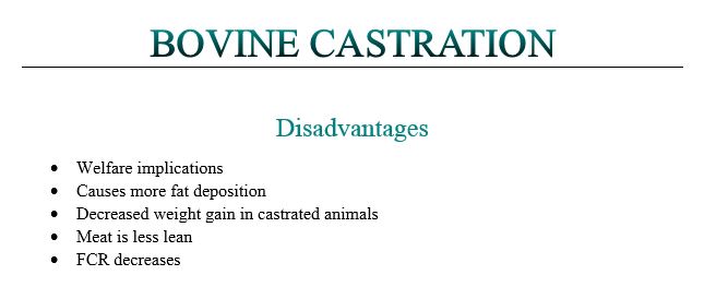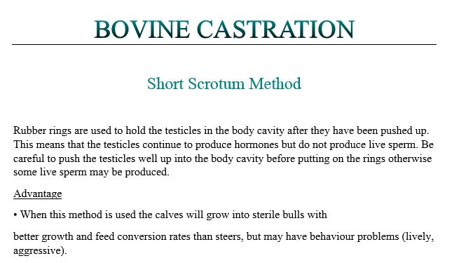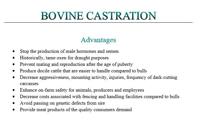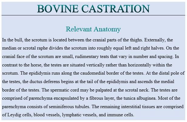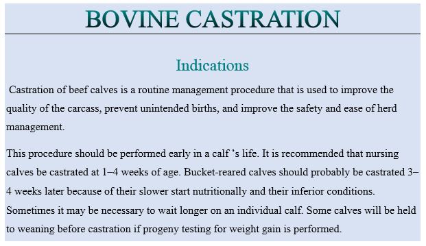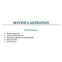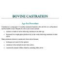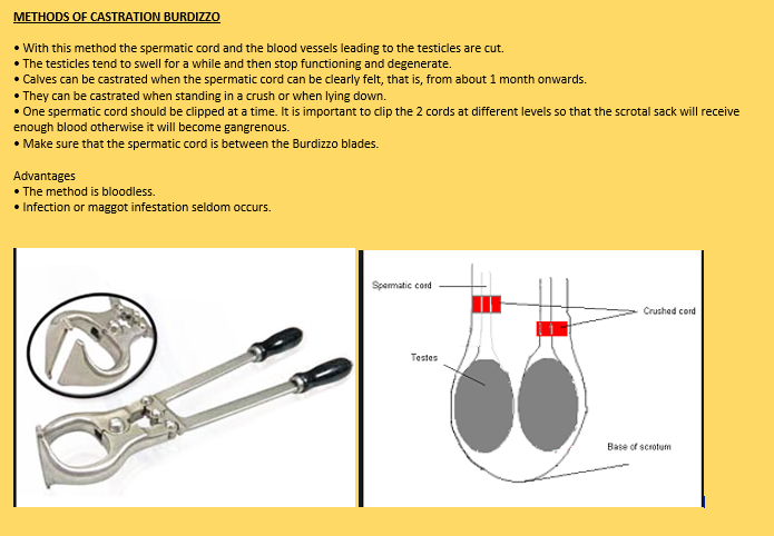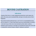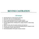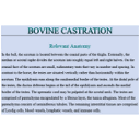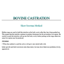 3days post op.jpg Advantages of Castration.JPG Age to Castrate.JPG Anatomy.jpg asa grade.jpg AVMA Welfare Implications of Bovine Castration.pdf Bovine Castration Instruments.pdf Bovine Castration Techniques.pdf Burdizzo castration.PNG Callicrate Bander.url Castration.url castration2.url Castration Drugs1.pdf Cattle restraint methods - YouTube.url Chemical and Hormonal Methods.JPG close castration.url Complications of castration.PNG Cow Head Halter Placement - YouTube.url Cryptorchidism and inguinal hernia.PNG Disadvantages of Castration.JPG drugs.PNG Elastrator and Burdizzo Video.url Elastrator Method.pdf Indications.JPG manual restraint.png one day post op.jpg Open castration.PNG open castration pictures.PNG other method.url Relevant Anatomy.JPG Scrotal exam.PNG Short Scrotum Method.JPG Tom's Fool Knot.png TPR.PNG