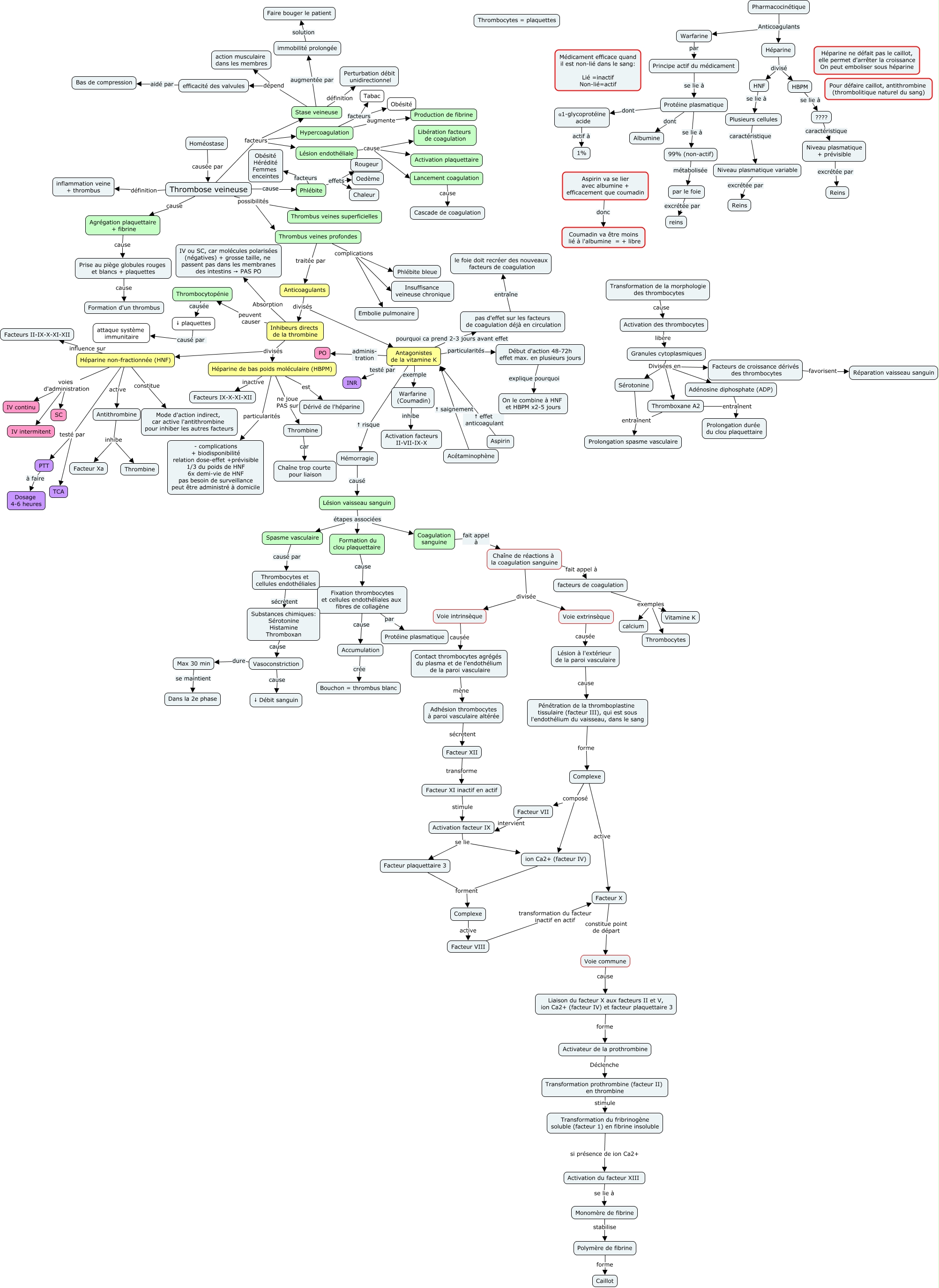 Cette carte de concepts créée avec IHMC CmapTools traite de: Maladie thrombotique, Voie extrinsèque causée Lésion à l'extérieur de la paroi vasculaire, Vasoconstriction dure Max 30 min, Hypercoagulation augmente Production de fibrine, Héparine non-fractionnée (HNF) voies d'administration SC, Activateur de la prothrombine Déclenche Transformation prothrombine (facteur II) en thrombine, Accumulation crée Bouchon = thrombus blanc, immobilité prolongée solution Faire bouger le patient, Fixation thrombocytes et cellules endothéliales aux fibres de collagène cause Accumulation, Transformation de la morphologie des thrombocytes cause Activation des thrombocytes, Thromboxane A2 entraînent Prolongation durée du clou plaquettaire, Activation du facteur XIII se lie à Monomère de fibrine, Aspirin ↑ effet anticoagulant Antagonistes de la vitamine K, Protéine plasmatique se lie à 99% (non-actif), Monomère de fibrine stabilise Polymère de fibrine, Polymère de fibrine forme Caillot, Protéine plasmatique dont Albumine, par le foie excrétée par reins, Hypercoagulation facteurs Obésité, Antithrombine inhibe Thrombine, Facteur VII intervient Activation facteur IX