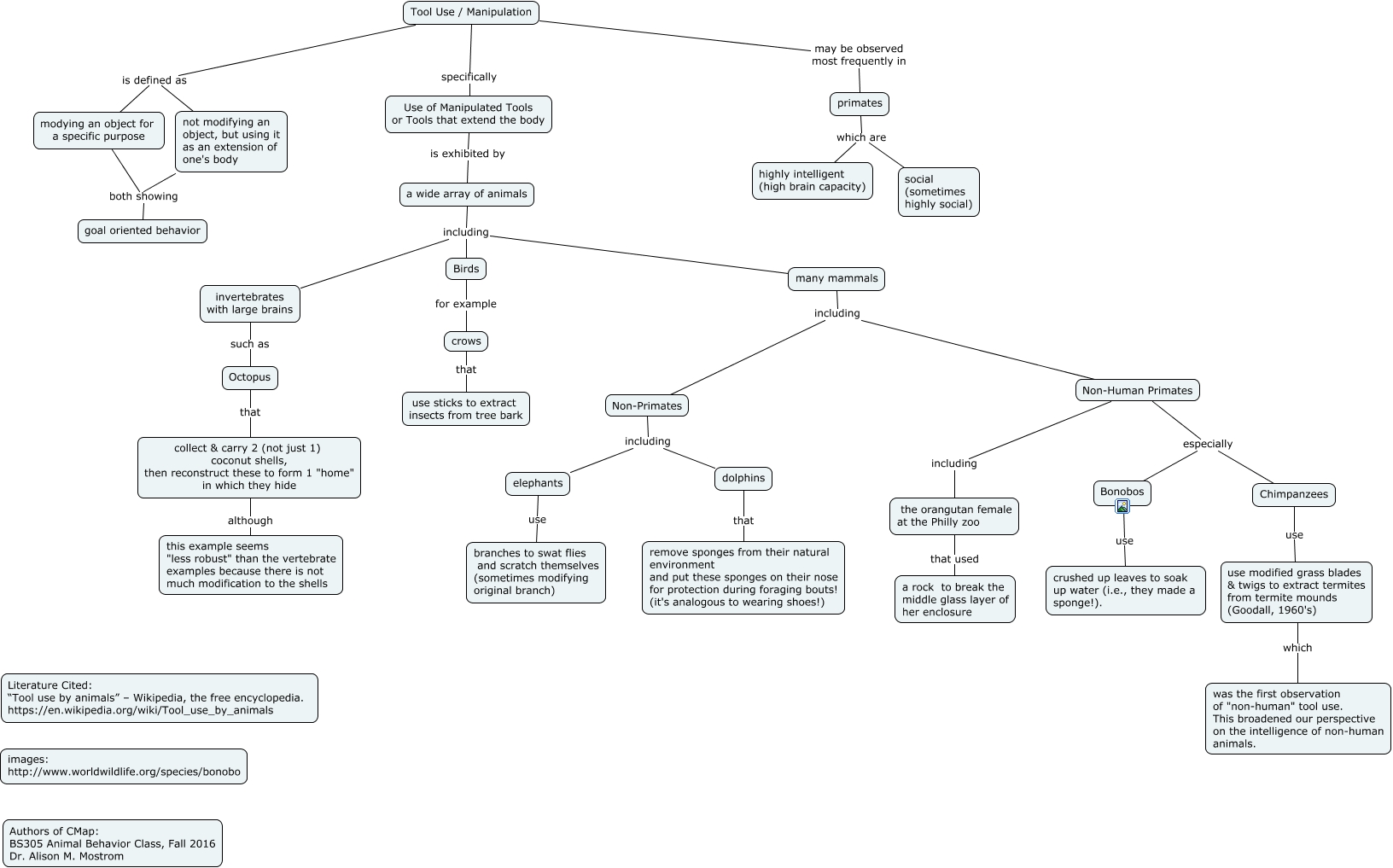 This Concept Map, created with IHMC CmapTools, has information related to: Wikipedia Tool Use 110216 (final), Non-Human Primates especially Chimpanzees, Non-Primates including dolphins, Chimpanzees use use modified grass blades & twigs to extract termites from termite mounds (Goodall, 1960's), Tool Use / Manipulation is defined as modying an object for a specific purpose, a wide array of animals including many mammals, the orangutan female at the Philly zoo that used a rock to break the middle glass layer of her enclosure, modying an object for a specific purpose both showing goal oriented behavior, a wide array of animals including invertebrates with large brains, collect & carry 2 (not just 1) coconut shells, then reconstruct these to form 1 "home" in which they hide although this example seems "less robust" than the vertebrate examples because there is not much modification to the shells, not modifying an object, but using it as an extension of one's body both showing goal oriented behavior, Bonobos use crushed up leaves to soak up water (i.e., they made a sponge!)., Non-Human Primates especially Bonobos, Non-Human Primates including the orangutan female at the Philly zoo, Tool Use / Manipulation may be observed most frequently in primates, use modified grass blades & twigs to extract termites from termite mounds (Goodall, 1960's) which was the first observation of "non-human" tool use. This broadened our perspective on the intelligence of non-human animals., Birds for example crows, primates which are highly intelligent (high brain capacity), Tool Use / Manipulation is defined as not modifying an object, but using it as an extension of one's body, crows that use sticks to extract insects from tree bark, elephants use branches to swat flies and scratch themselves (sometimes modifying original branch)