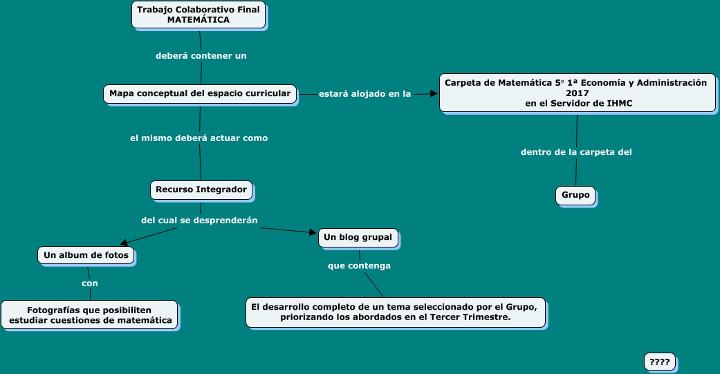 Este Cmap, tiene información relacionada con: Consigna Trabajo Colaborativo Final, Mapa conceptual del espacio curricular estará alojado en la Carpeta de Matemática 5° 1ª Economía y Administración 2017 en el Servidor de IHMC, Trabajo Colaborativo Final MATEMÁTICA deberá contener un Mapa conceptual del espacio curricular, Recurso Integrador del cual se desprenderán Un blog grupal, Mapa conceptual del espacio curricular el mismo deberá actuar como Recurso Integrador, Un blog grupal que contenga El desarrollo completo de un tema seleccionado por el Grupo, priorizando los abordados en el Tercer Trimestre., Recurso Integrador del cual se desprenderán Un album de fotos, Un album de fotos con Fotografías que posibiliten estudiar cuestiones de matemática, Carpeta de Matemática 5° 1ª Economía y Administración 2017 en el Servidor de IHMC dentro de la carpeta del Grupo