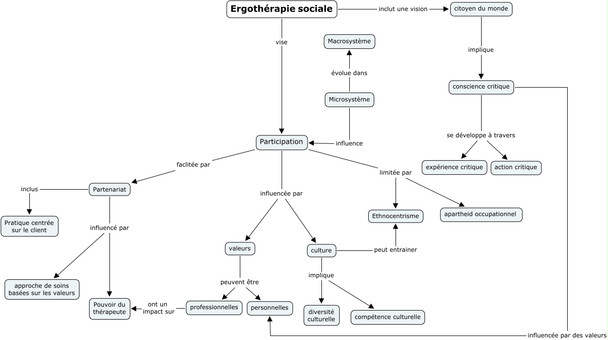 Cette carte de concepts créée avec IHMC CmapTools traite de: séminaire, Ergothérapie sociale inclut une vision citoyen du monde, culture implique diversité culturelle, Ergothérapie sociale vise Participation, conscience critique se développe à travers expérience critique, Participation influencée par valeurs, valeurs peuvent être personnelles, Partenariat inclus Pratique centrée sur le client, professionnelles ont un impact sur Pouvoir du thérapeute, Participation limitée par apartheid occupationnel, Microsystème évolue dans Macrosystème, conscience critique se développe à travers action critique, culture implique compétence culturelle, Participation faclitée par Partenariat, culture peut entrainer Ethnocentrisme, citoyen du monde implique conscience critique, Partenariat influencé par Pouvoir du thérapeute, Participation limitée par Ethnocentrisme, Microsystème influence Participation, Partenariat influencé par approche de soins basées sur les valeurs, valeurs peuvent être professionnelles