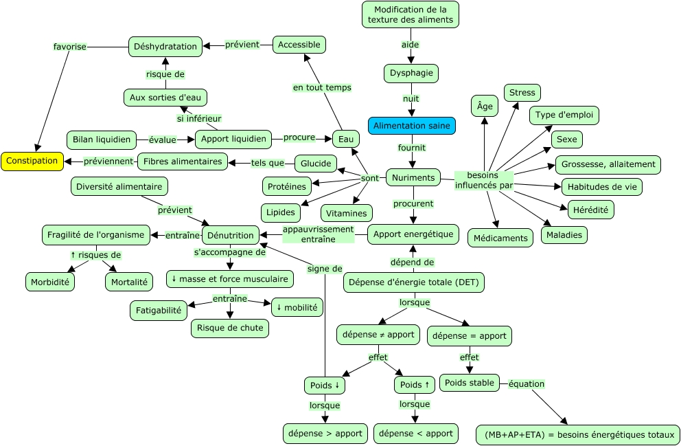 Cette carte de concepts créée avec IHMC CmapTools traite de: Nutrition, Nuriments procurent Apport energétique, ↓ masse et force musculaire entraîne Risque de chute, Aux sorties d'eau risque de Déshydratation, Fibres alimentaires préviennent Constipation, Nuriments besoins influencés par Hérédité, Modification de la texture des aliments aide Dysphagie, Dénutrition entraîne Fragilité de l'organisme, Bilan liquidien évalue Apport liquidien, Alimentation saine fournit Nuriments, Poids ↓ lorsque dépense > apport, Apport energétique appauvrissement entraîne Dénutrition, Dépense d'énergie totale (DET) lorsque dépense ≠ apport, Dépense d'énergie totale (DET) dépend de Apport energétique, ↓ masse et force musculaire entraîne Fatigabilité, Nuriments besoins influencés par Maladies, Fragilité de l'organisme ↑ risques de Mortalité, ↓ masse et force musculaire entraîne ↓ mobilité, Accessible prévient Déshydratation, dépense = apport effet Poids stable, Nuriments sont Glucide