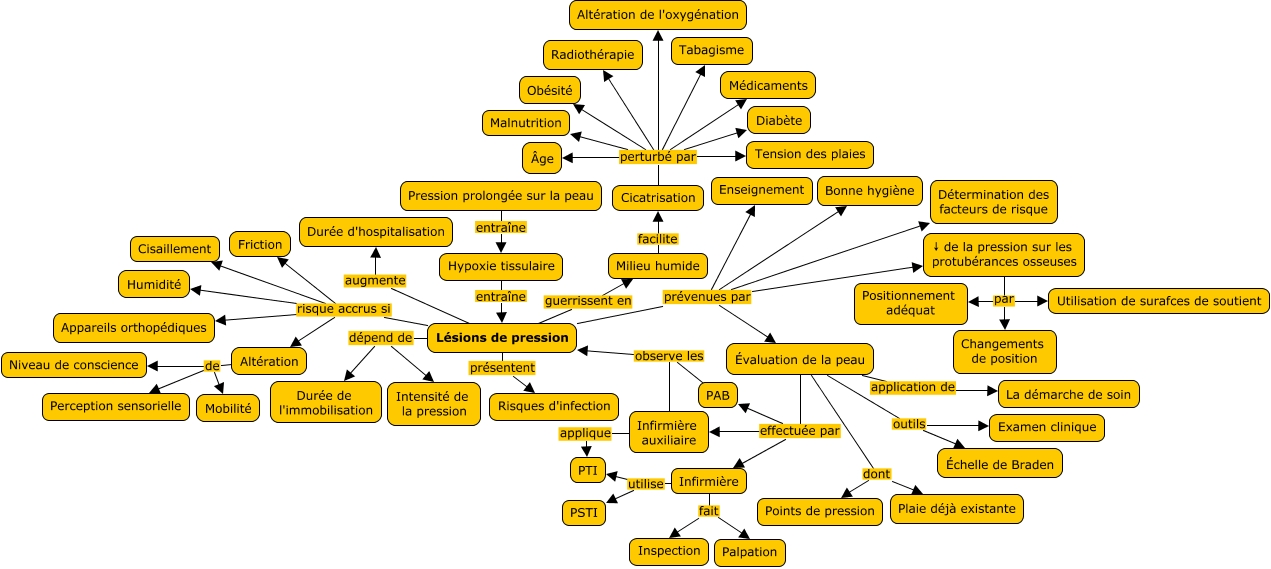 Cette carte de concepts créée avec IHMC CmapTools traite de: Intégrité de la peau, Lésions de pression dépend de Durée de l'immobilisation, Infirmière utilise PSTI, Infirmière fait Palpation, Évaluation de la peau outils Échelle de Braden, Altération de Niveau de conscience, Cicatrisation perturbé par Altération de l'oxygénation, Évaluation de la peau effectuée par PAB, Pression prolongée sur la peau entraîne Hypoxie tissulaire, Hypoxie tissulaire entraîne Lésions de pression, Lésions de pression risque accrus si Humidité, Cicatrisation perturbé par Radiothérapie, PAB observe les Lésions de pression, Lésions de pression risque accrus si Cisaillement, Lésions de pression prévenues par Détermination des facteurs de risque, Évaluation de la peau dont Plaie déjà existante, ↓ de la pression sur les protubérances osseuses par Positionnement adéquat, Cicatrisation perturbé par Obésité, Lésions de pression risque accrus si Appareils orthopédiques, Évaluation de la peau effectuée par Infirmière, Infirmière auxiliaire applique PTI