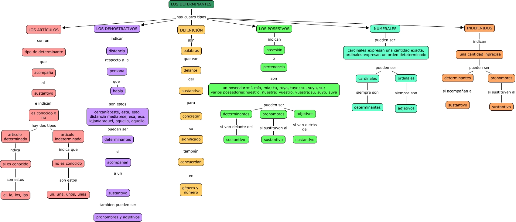 Este Cmap, tiene información relacionada con: LOS DETERMINANTES-Malena y Violeta-(terminado sin colorear)-6ºE.P, ordinales siempre son adjetivos, determinantes si acompañan al sustantivo, pertenencia son un poseedor:mí, mío, mía; tu, tuya, tuyo; su, suyo, su; varios poseedores:nuestro, nuestra; vuestro, vuestra;su, suyo, suya, LOS POSESIVOS indican posesión, una cantidad inprecisa pueden ser determinantes, pronombres si sustituyen al sustantivo, tipo de determinante que acompaña, una cantidad inprecisa pueden ser pronombres, LOS DETERMINANTES hay cuatro tipos NUMERALES, cardinales:expresan una cantidad exacta, ordinales:expresan un orden deteterminado pueden ser ordinales, LOS DETERMINANTES hay cuatro tipos LOS DEMOSTRATIVOS, distancia respecto a la persona, persona que habla, posesión o pertenencia, LOS DEMOSTRATIVOS indican distancia, no es conocido son estos un, una, unos, unas, acompañan a un sustantivo, cardinales:expresan una cantidad exacta, ordinales:expresan un orden deteterminado pueden ser cardinales, LOS DETERMINANTES hay cuatro tipos DEFINICIÓN, determinantes si acompañan