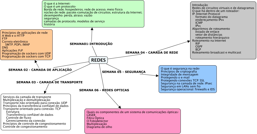 Esse mapa conceitual, produzido no IHMC CmapTools, tem a informação relacionada a: resumo, REDES SEMANA 03 - CAMADA DE TRANSPORTE Serviços da camada de transporte Multiplexação e demultiplexação Transporte não orientado para conexão: UDP Princípios da transferência confiável de dados Transporte orientado para conexão: TCP Estrutura Transferência confiável de dados Controle de fluxo Gerenciamento da conexão Princípios de controle de congestionamento Controle de congestionamento, REDES SEMANA 04 - CAMADA DE REDE Introdução Redes de circuitos virtuais e de datagramas O que há dentro de um roteador? IP: Internet Protocol formato do datagrama endereçamento IPv4 ICMP IPv6 Algoritmos de roteamento estado de enlace vetor de distâncias roteamento hierárquico Roteamento na Internet RIP OSPF BGP Roteamento broadcast e multicast, REDES SEMANA 05 - SEGURANÇA O que é segurança na rede? Princípios de criptografia Integridade de mensagem Protegendo o e-mail Protegendo conexões TCP: SSL Segurança na camada de rede: IPsec Segurança em LANs sem fio Segurança operacional: firewalls e IDS, REDES SEMANA01-INTRODUÇÃO O que é a Internet? O que é um protocolo? Borda de rede; hospedeiros, rede de acesso, meio físico. núcleo de rede: pacote/comutação de circuitos, estrutura da Internet; desempenho: perda, atraso, vazão segurança camadas de protocolo, modelos de serviço história, REDES SEMANA 06 - REDES OPTICAS Quais os componentes de um sistema de comunicações ópticas? LASER Fibra Óptica O Fotodetector Multiplexação Diagrama de olho, REDES SEMANA 02 - CAMADA DE APLICAÇÃO Princípios de aplicações de rede A Web e o HTTP FTP Correio eletrônico SMTP, POP3, IMAP DNS Aplicações P2P Programação de sockers com UDP Programação de sockers com TCP