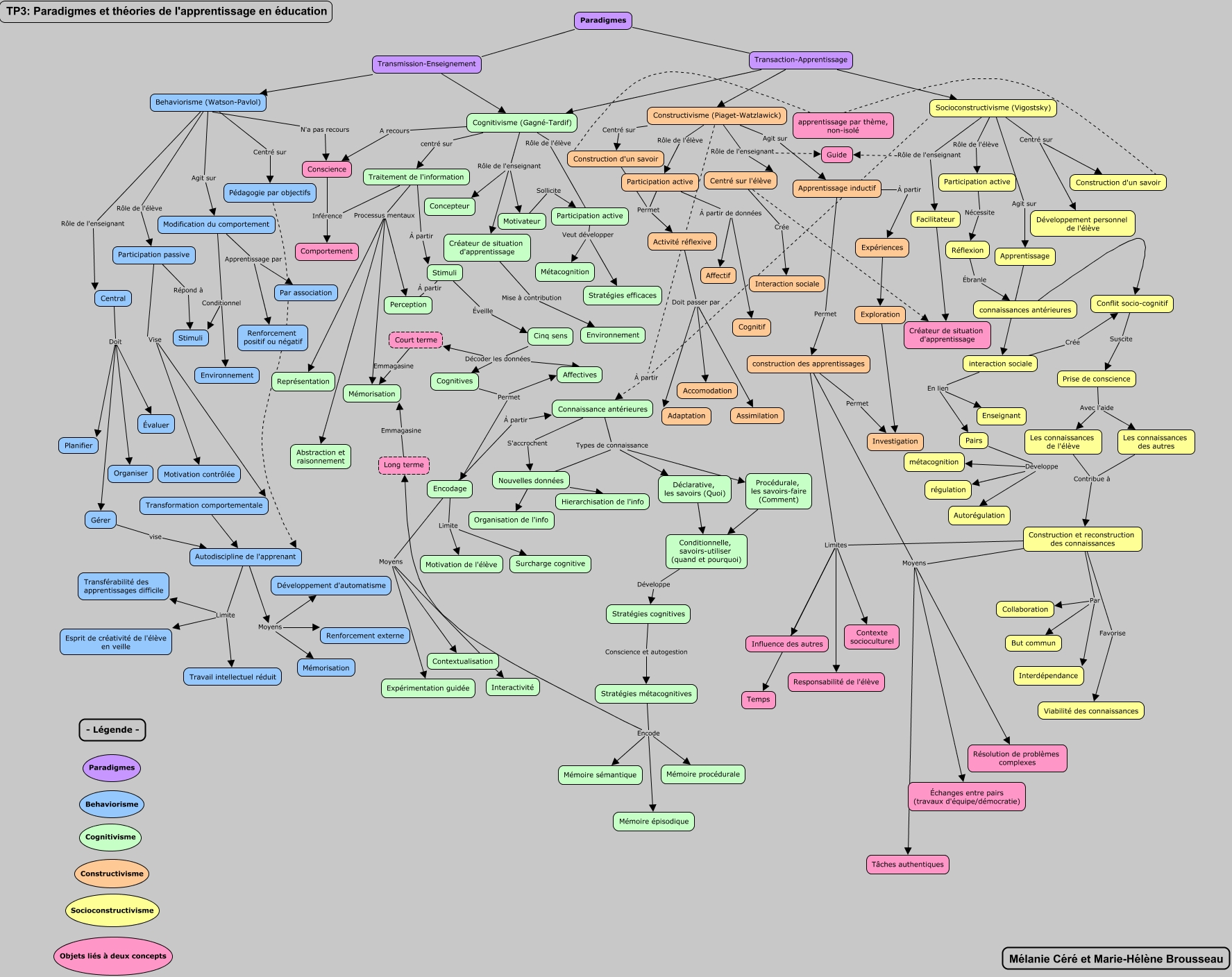 Cette carte de concepts créée avec IHMC CmapTools traite de: TP3_brousseau_céré, Conscience Inférence Comportement, Participation active Veut développer Métacognition, Construction et reconstruction des connaissances Moyens Tâches authentiques, Transaction-Apprentissage Constructivisme (Piaget-Watzlawick), Expériences Exploration, Centré sur l'élève Crée Interaction sociale, Court terme Emmagasine Mémorisation, Procédurale, les savoirs-faire (Comment) Conditionnelle, savoirs-utiliser (quand et pourquoi), Nouvelles données Organisation de l'info, Stratégies métacognitives Encode Mémoire sémantique, Stratégies métacognitives Encode Mémoire épisodique, Construction et reconstruction des connaissances Moyens Échanges entre pairs (travaux d'équipe/démocratie), Behaviorisme (Watson-Pavlol) Centré sur Pédagogie par objectifs, Encodage Limite Surcharge cognitive, Cinq sens Décoder les données Affectives, Autodiscipline de l'apprenant Limite Transférabilité des apprentissages difficile, Behaviorisme (Watson-Pavlol) N'a pas recours Conscience, Cognitivisme (Gagné-Tardif) centré sur Traitement de l'information, apprentissage par thème, non-isolé Construction d'un savoir, Perception À partir Stimuli
