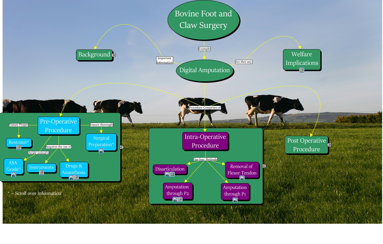 This Concept Map, created with IHMC CmapTools, has information related to: Foot and Claw Surgery, Post-Operative Procedure Possible Complications & Prognosis, Digital Amputation Important Information Background, Intra-Operative Procedure Has four Methods Removal of Flexor Tendon, Intra-Operative Procedure Has four Methods Amputation through P2, Bovine Foot and Claw Surgery Example Digital Amputation, Pre-Operative Procedure Requires the use of Instruments, Digital Amputation Are thre any Welfare Implications, Digital Amputation Procedure Comprises of Post-Operative Procedure, Intra-Operative Procedure Has four Methods Disarticulation, Digital Amputation Procedure Comprises of Pre-Operative Procedure, Pre-Operative Procedure Ensure thorough Surgical Preparation*, Intra-Operative Procedure Has four Methods Amputation through P1, Pre-Operative Procedure Requires the use of Drugs & Anaesthesia, Pre-Operative Procedure Ensure Proper Restraint*, Pre-Operative Procedure Decide animal's ASA Grade*, Post-Operative Procedure Proper After Care, Digital Amputation Procedure Comprises of Intra-Operative Procedure