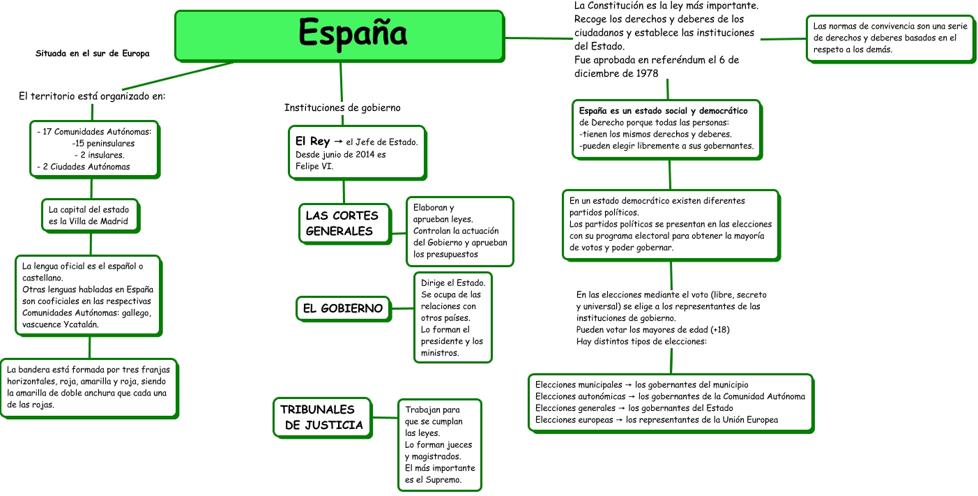 Este Cmap, tiene información relacionada con: ORGANIZACIÓN DEL TERRITORIO ESPAÑOL, TRIBUNALES DE JUSTICIA ???? Trabajan para que se cumplan las leyes. Lo forman jueces y magistrados. El más importante es el Supremo., EL GOBIERNO ???? Dirige el Estado. Se ocupa de las relaciones con otros países. Lo forman el presidente y los ministros., España La Constitución es la ley más importante. Recoge los derechos y deberes de los ciudadanos y establece las instituciones del Estado. Fue aprobada en referéndum el 6 de diciembre de 1978 Las normas de convivencia son una serie de derechos y deberes basados en el respeto a los demás., España El territorio está organizado en: La bandera está formada por tres franjas horizontales, roja, amarilla y roja, siendo la amarilla de doble anchura que cada una de las rojas., LAS CORTES GENERALES ???? Elaboran y aprueban leyes. Controlan la actuación del Gobierno y aprueban los presupuestos, España La Constitución es la ley más importante. Recoge los derechos y deberes de los ciudadanos y establece las instituciones del Estado. Fue aprobada en referéndum el 6 de diciembre de 1978 En un estado democrático existen diferentes partidos políticos. Los partidos políticos se presentan en las elecciones con su programa electoral para obtener la mayoría de votos y poder gobernar., España Instituciones de gobierno LAS CORTES GENERALES, En un estado democrático existen diferentes partidos políticos. Los partidos políticos se presentan en las elecciones con su programa electoral para obtener la mayoría de votos y poder gobernar. En las elecciones mediante el voto (libre, secreto y universal) se elige a los representantes de las instituciones de gobierno. Pueden votar los mayores de edad (+18) Hay distintos tipos de elecciones: Elecciones municipales → los gobernantes del municipio Elecciones autonómicas → los gobernantes de la Comunidad Autónoma Elecciones generales → los gobernantes del Estado Elecciones europeas → los representantes de la Unión Europea