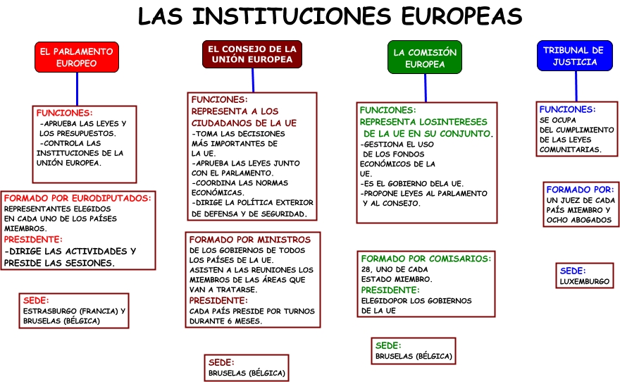 Este Cmap, tiene información relacionada con: INSTITUCIONES EUROPEAS, TRIBUNAL DE JUSTICIA ???? FUNCIONES: SE OCUPA DEL CUMPLIMIENTO DE LAS LEYES COMUNITARIAS., EL CONSEJO DE LA UNIÓN EUROPEA ???? FUNCIONES: REPRESENTA A LOS CIUDADANOS DE LA UE -TOMA LAS DECISIONES MÁS IMPORTANTES DE LA UE. -APRUEBA LAS LEYES JUNTO CON EL PARLAMENTO. -COORDINA LAS NORMAS ECONÓMICAS. -DIRIGE LA POLÍTICA EXTERIOR DE DEFENSA Y DE SEGURIDAD., EL PARLAMENTO EUROPEO ???? FUNCIONES: -APRUEBA LAS LEYES Y LOS PRESUPUESTOS. -CONTROLA LAS INSTITUCIONES DE LA UNIÓN EUROPEA., LA COMISIÓN EUROPEA ???? FUNCIONES: REPRESENTA LOSINTERESES DE LA UE EN SU CONJUNTO. -GESTIONA EL USO DE LOS FONDOS ECONÓMICOS DE LA UE. -ES EL GOBIERNO DELA UE. -PROPONE LEYES AL PARLAMENTO Y AL CONSEJO.