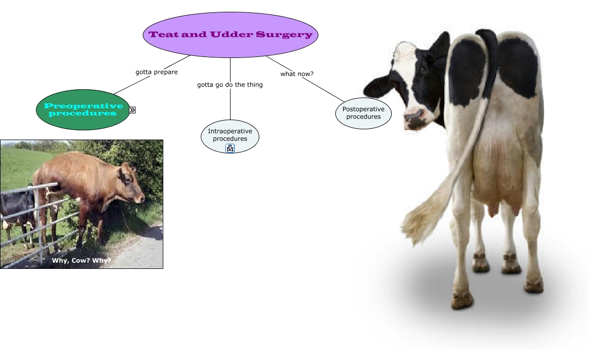 This Concept Map, created with IHMC CmapTools, has information related to: Gen map back up, Preoperative procedures does she need it and can she survive a surgery Teat laceration classification, Teat and Udder Surgery gotta prepare Preoperative procedures, Preoperative procedures saftey first! prevention is better than cure Local anesthesia of the teats (mouse over), Teat and Udder Surgery what now? Postoperative procedures, Preoperative procedures saftey first! prevention is better than cure Restraint and sedation (mouse over), Preoperative procedures lets get it started Surgical preparation (mouse over), Teat and Udder Surgery gotta go do the thing Intraoperative procedures, Preoperative procedures lets get it started Equiptment and instruments, Preoperative procedures know the normal so you can fix the abnormal Udder and teat anatomy, Preoperative procedures does she need it and can she survive a surgery BCS, Physical exam and examination of the udder and ASA grade, Preoperative procedures saftey first! prevention is better than cure Other drugs (mouse over)