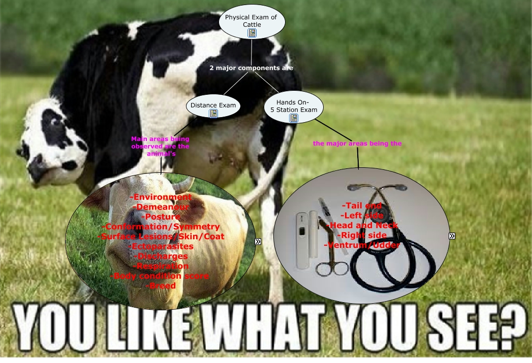 This Concept Map, created with IHMC CmapTools, has information related to: Physical exam cmap, Distance Exam Main areas being observed are the animal's Surface lesions/ Skin/ Coat, Distance Exam Main areas being observed are the animal's Breed, Hands On- 5 Station Exam the major areas being the Station 5- Ventrum/Udder, Physical Exam of Cattle 2 major components are Distance Exam, Distance Exam Main areas being observed are the animal's Body condition score, Distance Exam Main areas being observed are the animal's -Environment -Demeanour -Posture -Conformation/Symmetry -Surface Lesions/Skin/Coat -Ectoparasites -Discharges -Respiration -Body condition score -Breed, Hands On- 5 Station Exam the major areas being the -Tail end -Left side -Head and Neck -Right side -Ventrum/Udder, Hands On- 5 Station Exam the major areas being the Station 3- Head and neck, Distance Exam Main areas being observed are the animal's Conformation/symmetry, Hands On- 5 Station Exam the major areas being the Station 2- Left side, Distance Exam Main areas being observed are the animal's Demeanour, Breed Different breeds can have different NORMAL conformation Conformation/symmetry, Distance Exam Main areas being observed are the animal's -Environment -Demeanour -Posture -Conformation/Symmetry -Surface Lesions/Skin/Coat -Ectoparasites -Discharges -Respiration -Body condition score -Breed, Hands On- 5 Station Exam the major areas being the Station 4- Right side, Surface lesions/ Skin/ Coat Skin lesions can indicate ectoparasites Ectoparasites, Hands On- 5 Station Exam the major areas being the Station 1- Tail end, Distance Exam Main areas being observed are the animal's Posture, Distance Exam Main areas being observed are the animal's Respiration, Distance Exam Main areas being observed are the animal's Environment, Physical Exam of Cattle 2 major components are Hands On- 5 Station Exam
