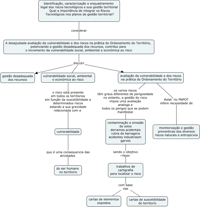 Esse mapa conceitual, produzido no IHMC CmapTools, tem a informação relacionada a: tecnologico_2, A desajustada avaliação da vulnerabilidade e dos riscos na prática do Ordenamento do Território, potenciando a gestão desadequada dos recursos, contribui para o incremento da vulnerabilidade social, ambiental e económica ao risco discutir avaliação da vulnerabilidade e dos riscos na prática do Ordenamento do Território, vulnerabilidade social, ambiental e económica ao risco o risco está presente em todos os territorios em função da suscetibilidade a determinados riscos estando a sua gravidade relacionada com a vulnerabilidade, vulnerabilidade que é uma consequencia das atividades do ser humano no territorio, Identificação, caracterização e enquadramento legal dos riscos tecnológicos e sua gestão territorial Qual a importância de integrar os Riscos Tecnológicos nos planos de gestão territorial? considerar A desajustada avaliação da vulnerabilidade e dos riscos na prática do Ordenamento do Território, potenciando a gestão desadequada dos recursos, contribui para o incremento da vulnerabilidade social, ambiental e económica ao risco, avaliação da vulnerabilidade e dos riscos na prática do Ordenamento do Território Relat´rio PNPOT refere necessidade de monitorização e gestão preventivas dos diversos riscos naturais e antropicvos, contaminação e erossão de solos derrames acidentais rutira de barragens acidentes industriasm garves sendo o obejtivo ~fazer trabalhos de cartigrafia para localizar o risco, avaliação da vulnerabilidade e dos riscos na prática do Ordenamento do Território os varios riscos têm graus diferentes de perigosidade no entanto, a gestão do risco impoe uma avaliação analoga a todos os perigos que se podem manifestar contaminação e erossão de solos derrames acidentais rutira de barragens acidentes industriasm garves, trabalhos de cartigrafia para localizar o risco com base nas cartas de elementos expostos, A desajustada avaliação da vulnerabilidade e dos riscos na prática do Ordenamento do Território, potenciando a gestão desadequada dos recursos, contribui para o incremento da vulnerabilidade social, ambiental e económica ao risco discutir gestão desadequada dos recursos, trabalhos de cartigrafia para localizar o risco com base nas cartas de suscetibilidade do territorio, A desajustada avaliação da vulnerabilidade e dos riscos na prática do Ordenamento do Território, potenciando a gestão desadequada dos recursos, contribui para o incremento da vulnerabilidade social, ambiental e económica ao risco discutir vulnerabilidade social, ambiental e económica ao risco