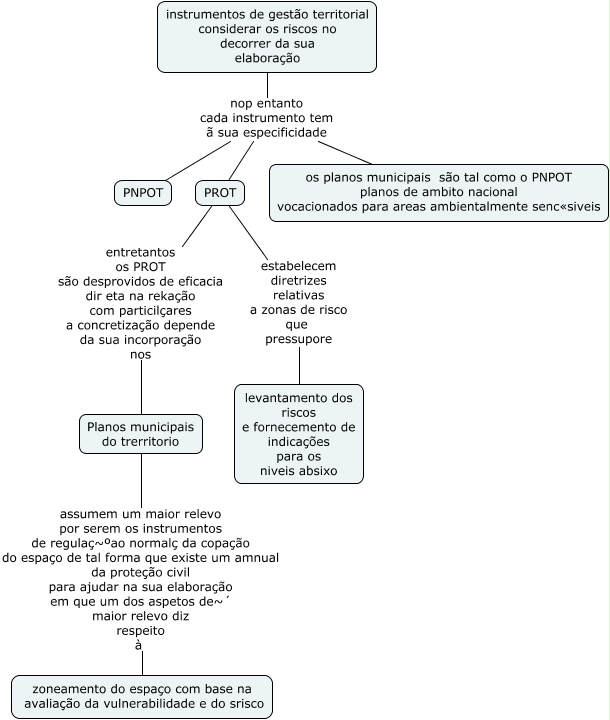 Esse mapa conceitual, produzido no IHMC CmapTools, tem a informação relacionada a: tecnologico_4, Planos municipais do trerritorio assumem um maior relevo por serem os instrumentos de regulaç~ºao normalç da copação do espaço de tal forma que existe um amnual da proteção civil para ajudar na sua elaboração em que um dos aspetos de~´ maior relevo diz respeito à zoneamento do espaço com base na avaliação da vulnerabilidade e do srisco, PROT estabelecem diretrizes relativas a zonas de risco que pressupore levantamento dos riscos e fornecemento de indicações para os niveis absixo, PROT entretantos os PROT são desprovidos de eficacia dir eta na rekação com particilçares a concretização depende da sua incorporação nos Planos municipais do trerritorio, instrumentos de gestão territorial considerar os riscos no decorrer da sua elaboração nop entanto cada instrumento tem ã sua especificidade PROT, instrumentos de gestão territorial considerar os riscos no decorrer da sua elaboração nop entanto cada instrumento tem ã sua especificidade os planos municipais são tal como o PNPOT planos de ambito nacional vocacionados para areas ambientalmente senc«siveis, instrumentos de gestão territorial considerar os riscos no decorrer da sua elaboração nop entanto cada instrumento tem ã sua especificidade PNPOT