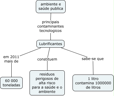 Esse mapa conceitual, produzido no IHMC CmapTools, tem a informação relacionada a: contaminantes_4, Lubrificantes sabe-se que 1 litro contamina 1000000 de litros, ambiente e saúde publica principais contaminantes tecnologicos Lubrificantes, Lubrificantes constituem residuos perigosos de alta risco para a saúde e o ambiente, Lubrificantes em 2011 mais de 60 000 toneladas