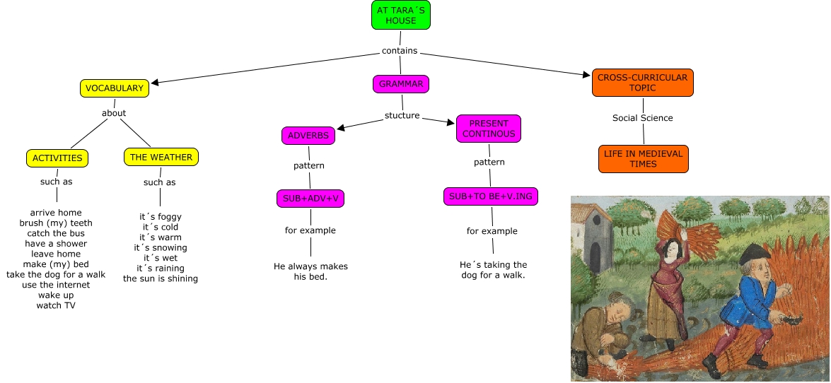 Este Cmap, tiene información relacionada con: AT TARA'S HOUSE_Santiago, PRESENT CONTINOUS pattern SUB+TO BE+V.ING, GRAMMAR stucture PRESENT CONTINOUS, SUB+TO BE+V.ING for example He´s taking the dog for a walk., THE WEATHER such as it´s foggy it´s cold it´s warm it´s snowing it´s wet it´s raining the sun is shining, ADVERBS pattern SUB+ADV+V, GRAMMAR stucture ADVERBS, AT TARA´S HOUSE contains CROSS-CURRICULAR TOPIC, VOCABULARY about ACTIVITIES, CROSS-CURRICULAR TOPIC Social Science LIFE IN MEDIEVAL TIMES, AT TARA´S HOUSE contains GRAMMAR, VOCABULARY about THE WEATHER, SUB+ADV+V for example He always makes his bed., AT TARA´S HOUSE contains VOCABULARY, ACTIVITIES such as arrive home brush (my) teeth catch the bus have a shower leave home make (my) bed take the dog for a walk use the internet wake up watch TV