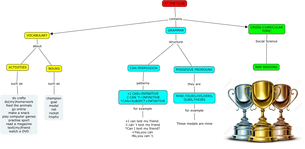 Este Cmap, tiene información relacionada con: AT THE CLUB-Ángel, CROSS-CURRICULAR TOPIC Social Science MAP READING, AT THE CLUB contains CROSS-CURRICULAR TOPIC, AT THE CLUB contains GRAMMAR, ACTIVITIES such as do crafts do(my)homerwork feed the animals go online make a snack play computer games practise sport read a megazine text(my)friend watch a DVD, GRAMMAR structure CAN.PERMISSION, VOCABULARY about ACTIVITIES, POSSESIVE PRONOUNS they are MINE,YOURS,HIS,HERS, OURS,THEIRS, NOUNS such as champion goal medal net rocket trophy, VOCABULARY about NOUNS, MINE,YOURS,HIS,HERS, OURS,THEIRS for example These medals are mine, +I CAN+INFINITIVE -I CAN´T+INFINITIVE *CAN+SUBJECT+INFINITIVE for example +I can test my friend. -I can´t text my friend *Can I text my friend? +Yes,you can -No,you can´t., CAN.PERMISSION patterns +I CAN+INFINITIVE -I CAN´T+INFINITIVE *CAN+SUBJECT+INFINITIVE, AT THE CLUB contains VOCABULARY, GRAMMAR structure POSSESIVE PRONOUNS
