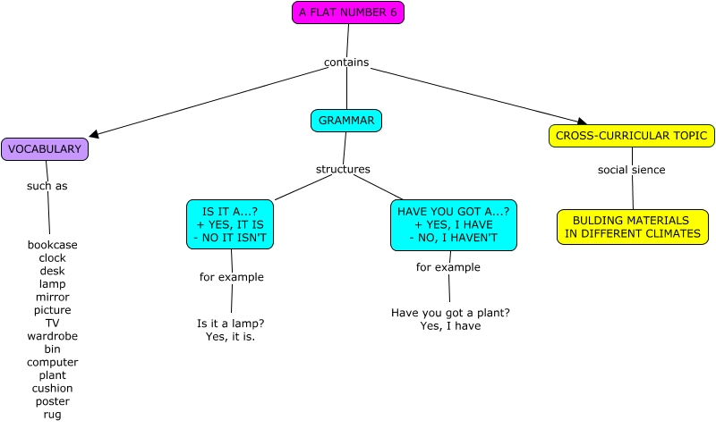 Este Cmap, tiene información relacionada con: AT FLAT NUMBER 6 (Carla y Diana), A FLAT NUMBER 6 contains GRAMMAR, A FLAT NUMBER 6 contains VOCABULARY, VOCABULARY such as bookcase clock desk lamp mirror picture TV wardrobe bin computer plant cushion poster rug, CROSS-CURRICULAR TOPIC social sience BULDING MATERIALS IN DIFFERENT CLIMATES, GRAMMAR structures IS IT A...? + YES, IT IS - NO IT ISN'T, HAVE YOU GOT A...? + YES, I HAVE - NO, I HAVEN'T for example Have you got a plant? Yes, I have, A FLAT NUMBER 6 contains CROSS-CURRICULAR TOPIC, GRAMMAR structures HAVE YOU GOT A...? + YES, I HAVE - NO, I HAVEN'T, IS IT A...? + YES, IT IS - NO IT ISN'T for example Is it a lamp? Yes, it is.