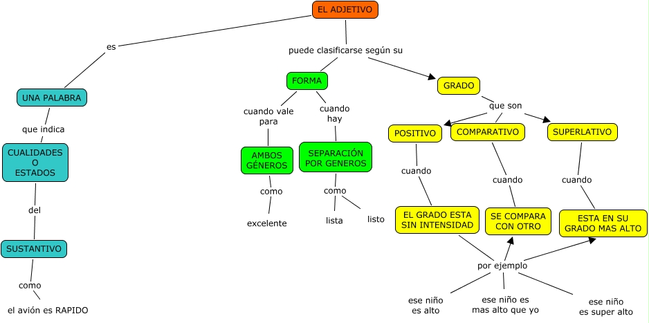 Este Cmap, tiene información relacionada con: LOS ADJETIVOS DE Jaime y YAGO, FORMA cuando vale para AMBOS GÉNEROS, FORMA cuando hay SEPARACIÓN POR GENEROS, EL ADJETIVO es UNA PALABRA, UNA PALABRA que indica CUALIDADES O ESTADOS, EL ADJETIVO puede clasificarse según su GRADO, EL ADJETIVO puede clasificarse según su FORMA, EL GRADO ESTA SIN INTENSIDAD por ejemplo ese niño es mas alto que yo, EL GRADO ESTA SIN INTENSIDAD por ejemplo ese niño es super alto, EL GRADO ESTA SIN INTENSIDAD por ejemplo SE COMPARA CON OTRO, POSITIVO cuando EL GRADO ESTA SIN INTENSIDAD, EL GRADO ESTA SIN INTENSIDAD por ejemplo ESTA EN SU GRADO MAS ALTO, AMBOS GÉNEROS como excelente, SEPARACIÓN POR GENEROS como lista, EL GRADO ESTA SIN INTENSIDAD por ejemplo ese niño es alto, GRADO que son COMPARATIVO, SUSTANTIVO como el avión es RAPIDO, SEPARACIÓN POR GENEROS como listo, CUALIDADES O ESTADOS del SUSTANTIVO, GRADO que son SUPERLATIVO, COMPARATIVO cuando SE COMPARA CON OTRO