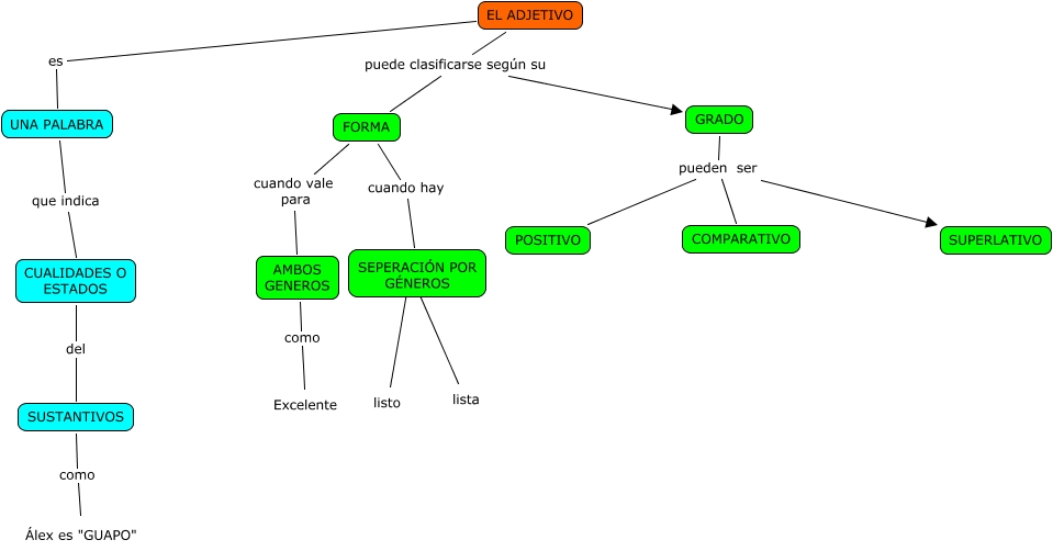 Este Cmap, tiene información relacionada con: EL ADJETIVO ALEX Y ALEJANDRA, SEPERACIÓN POR GÉNEROS ???? lista, SUSTANTIVOS como Álex es "GUAPO", SEPERACIÓN POR GÉNEROS ???? listo, UNA PALABRA que indica CUALIDADES O ESTADOS, GRADO pueden ser SUPERLATIVO, GRADO pueden ser COMPARATIVO, FORMA cuando vale para AMBOS GENEROS, EL ADJETIVO puede clasificarse según su GRADO, CUALIDADES O ESTADOS del SUSTANTIVOS, AMBOS GENEROS como Excelente, FORMA cuando hay SEPERACIÓN POR GÉNEROS, EL ADJETIVO puede clasificarse según su FORMA, EL ADJETIVO es UNA PALABRA, GRADO pueden ser POSITIVO