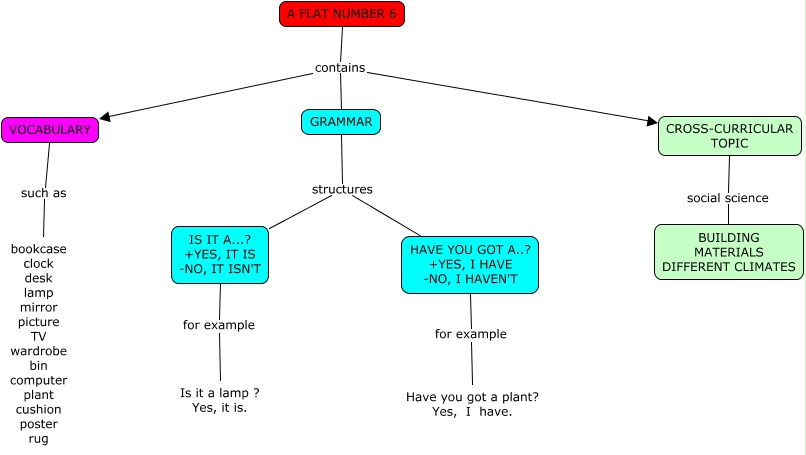 Este Cmap, tiene información relacionada con: AT FLAT NUMBER 6 (Noa,Débora y Sofia), A FLAT NUMBER 6 contains GRAMMAR, IS IT A...? +YES, IT IS -NO, IT ISN'T for example Is it a lamp ? Yes, it is., CROSS-CURRICULAR TOPIC social science BUILDING MATERIALS DIFFERENT CLIMATES, GRAMMAR structures IS IT A...? +YES, IT IS -NO, IT ISN'T, GRAMMAR structures HAVE YOU GOT A..? +YES, I HAVE -NO, I HAVEN'T, HAVE YOU GOT A..? +YES, I HAVE -NO, I HAVEN'T for example Have you got a plant? Yes, I have., VOCABULARY such as bookcase clock desk lamp mirror picture TV wardrobe bin computer plant cushion poster rug, A FLAT NUMBER 6 contains VOCABULARY, A FLAT NUMBER 6 contains CROSS-CURRICULAR TOPIC