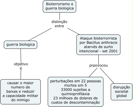 Esse mapa conceitual, produzido no IHMC CmapTools, tem a informação relacionada a: bioterrorismo_2, Bioterrorismo e guerra biologica distinção entre Ataque bioterrorrista por Bacillus anthracis atarvés de surto intencional - set 2001, Ataque bioterrorrista por Bacillus anthracis atarvés de surto intencional - set 2001 prpovocou disrupção societal global, Bioterrorismo e guerra biologica distinção entre guerra biologica, guerra biologica objetivo é causar o maior numero de baixas e reduzir a capacidade militar do inimigo, Ataque bioterrorrista por Bacillus anthracis atarvés de surto intencional - set 2001 prpovocou perturbações em 22 pessoas mortes em 5 33000 sujeitas a quimioprofilaxia 23 milhoes de dolares de custos de descontaminação