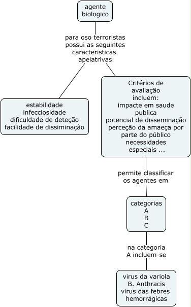 Esse mapa conceitual, produzido no IHMC CmapTools, tem a informação relacionada a: bioterrorismo_3, Critérios de avaliação incluem: impacte em saude publica potencial de disseminação perceção da amaeça por parte do público necessidades especiais ... permite classificar os agentes em categorias A B C, agente biologico para oso terroristas possui as seguintes caracteristicas apelatrivas Critérios de avaliação incluem: impacte em saude publica potencial de disseminação perceção da amaeça por parte do público necessidades especiais ..., categorias A B C na categoria A incluem-se virus da variola B. Anthracis virus das febres hemorrágicas, agente biologico para oso terroristas possui as seguintes caracteristicas apelatrivas estabilidade infecciosidade dificuldade de deteção facilidade de dissiminação