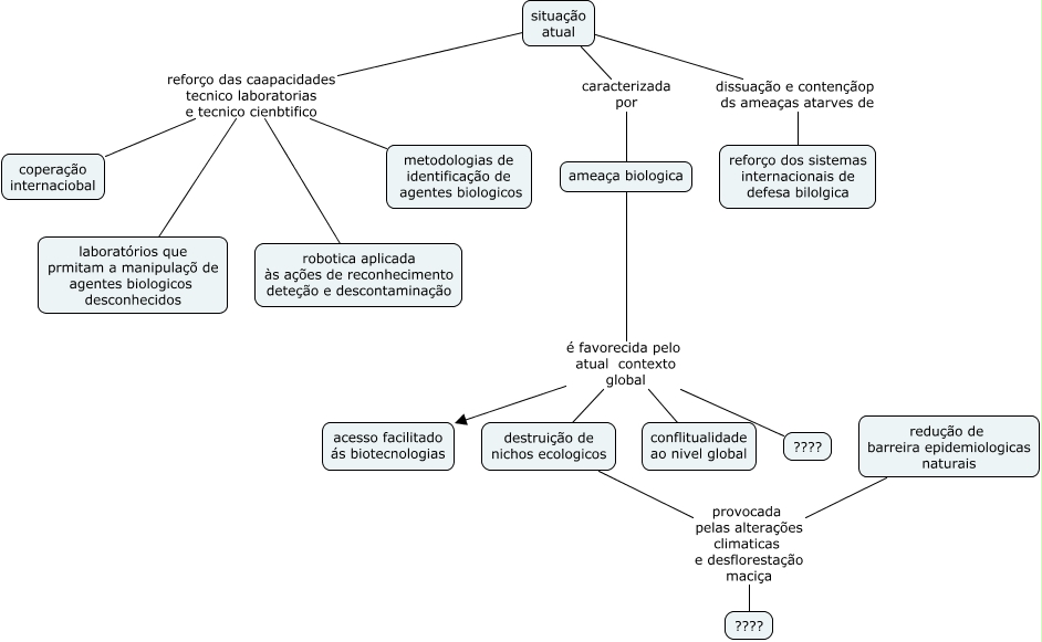 Esse mapa conceitual, produzido no IHMC CmapTools, tem a informação relacionada a: bioterrorismo_7, ameaça biologica é favorecida pelo atual contexto global ????, ameaça biologica é favorecida pelo atual contexto global acesso facilitado ás biotecnologias, situação atual reforço das caapacidades tecnico laboratorias e tecnico cienbtifico robotica aplicada às ações de reconhecimento deteção e descontaminação, redução de barreira epidemiologicas naturais provocada pelas alterações climaticas e desflorestação maciça ????, situação atual reforço das caapacidades tecnico laboratorias e tecnico cienbtifico laboratórios que prmitam a manipulaçõ de agentes biologicos desconhecidos, situação atual caracterizada por ameaça biologica, situação atual reforço das caapacidades tecnico laboratorias e tecnico cienbtifico coperação internaciobal, destruição de nichos ecologicos provocada pelas alterações climaticas e desflorestação maciça ????, situação atual dissuação e contençãop ds ameaças atarves de reforço dos sistemas internacionais de defesa bilolgica, ameaça biologica é favorecida pelo atual contexto global conflitualidade ao nivel global, situação atual reforço das caapacidades tecnico laboratorias e tecnico cienbtifico metodologias de identificação de agentes biologicos, ameaça biologica é favorecida pelo atual contexto global destruição de nichos ecologicos