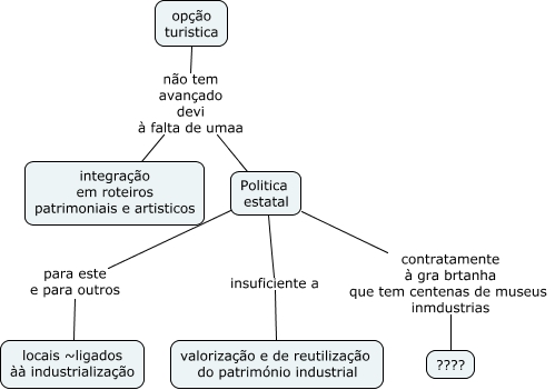 Esse mapa conceitual, produzido no IHMC CmapTools, tem a informação relacionada a: estetica_5, Politica estatal para este e para outros locais ~ligados àà industrialização, opção turistica não tem avançado devi à falta de umaa Politica estatal, opção turistica não tem avançado devi à falta de umaa integração em roteiros patrimoniais e artisticos, Politica estatal contratamente à gra brtanha que tem centenas de museus inmdustrias ????, Politica estatal insuficiente a valorização e de reutilização do património industrial