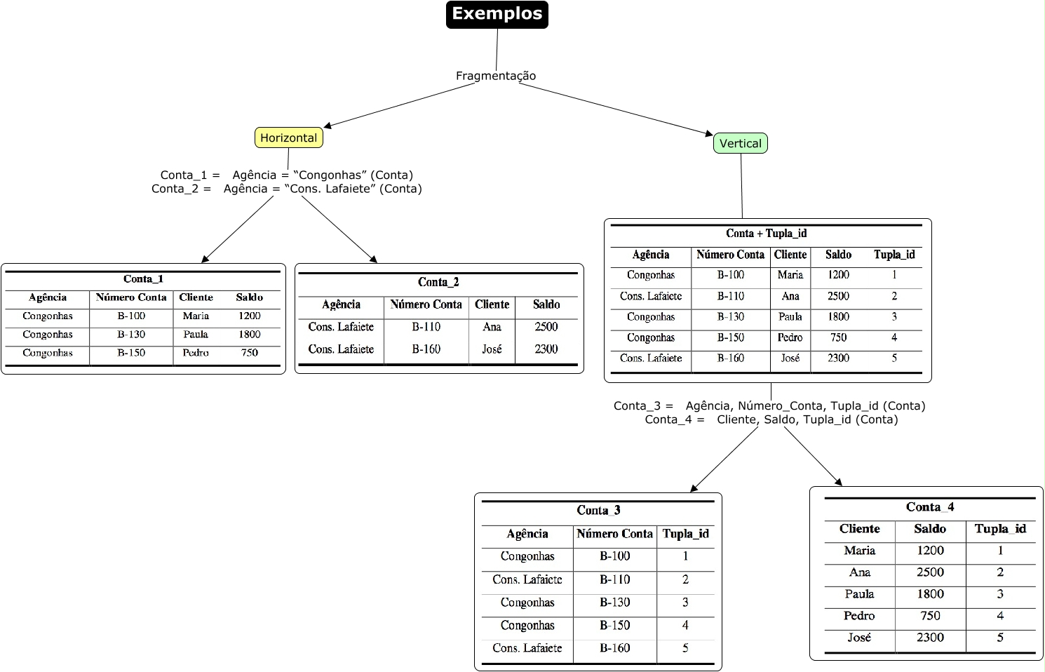 Esse mapa conceitual, produzido no IHMC CmapTools, tem a informação relacionada a: fragmentacao, Horizontal Conta_1 = Agência = “Congonhas” (Conta) Conta_2 = Agência = “Cons. Lafaiete” (Conta), Vertical ????, Conta_3 = Agência, Número_Conta, Tupla_id (Conta) Conta_4 = Cliente, Saldo, Tupla_id (Conta), Exemplos Fragmentação Horizontal, Horizontal Conta_1 = Agência = “Congonhas” (Conta) Conta_2 = Agência = “Cons. Lafaiete” (Conta), Exemplos Fragmentação Vertical, Conta_3 = Agência, Número_Conta, Tupla_id (Conta) Conta_4 = Cliente, Saldo, Tupla_id (Conta)