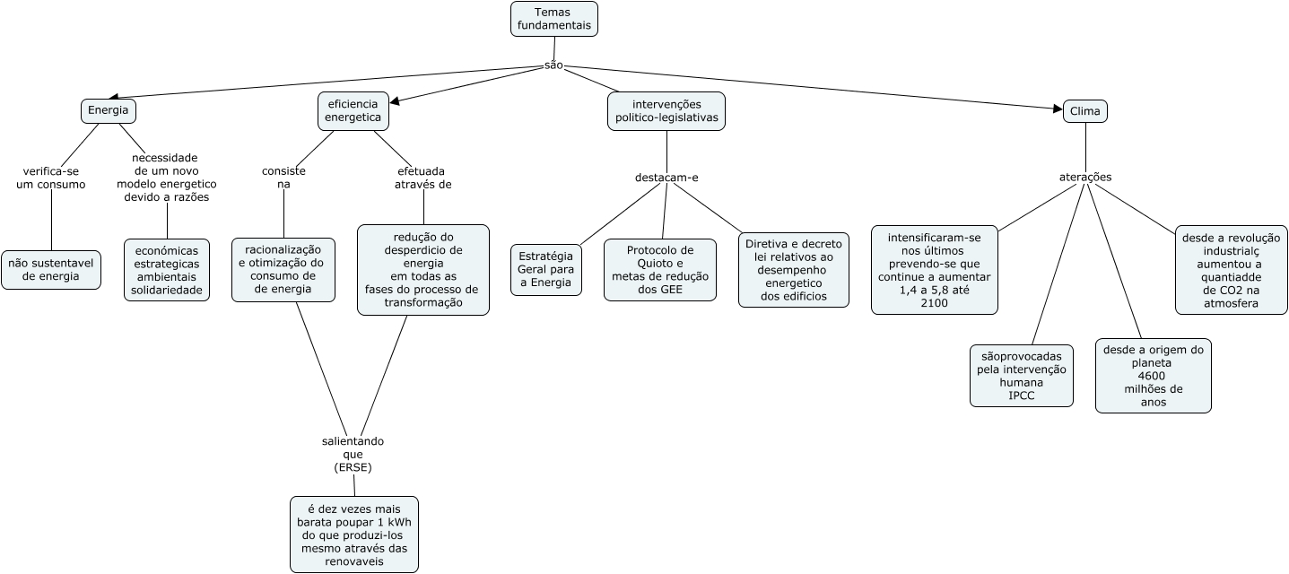 Esse mapa conceitual, produzido no IHMC CmapTools, tem a informação relacionada a: enquadramento 1, intervenções politico-legislativas destacam-e Diretiva e decreto lei relativos ao desempenho energetico dos edificios, Clima aterações desde a origem do planeta 4600 milhões de anos, Temas fundamentais são eficiencia energetica, Energia necessidade de um novo modelo energetico devido a razões económicas estrategicas ambientais solidariedade, Clima aterações sãoprovocadas pela intervenção humana IPCC, redução do desperdicio de energia em todas as fases do processo de transformação salientando que (ERSE) é dez vezes mais barata poupar 1 kWh do que produzi-los mesmo através das renovaveis, Energia verifica-se um consumo não sustentavel de energia, Clima aterações intensificaram-se nos últimos prevendo-se que continue a aumentar 1,4 a 5,8 até 2100, eficiencia energetica consiste na racionalização e otimização do consumo de de energia, Clima aterações desde a revolução industrialç aumentou a quantiadde de CO2 na atmosfera, intervenções politico-legislativas destacam-e Protocolo de Quioto e metas de redução dos GEE, Temas fundamentais são Energia, Temas fundamentais são Clima, eficiencia energetica efetuada através de redução do desperdicio de energia em todas as fases do processo de transformação, intervenções politico-legislativas destacam-e Estratégia Geral para a Energia, racionalização e otimização do consumo de de energia salientando que (ERSE) é dez vezes mais barata poupar 1 kWh do que produzi-los mesmo através das renovaveis, Temas fundamentais são intervenções politico-legislativas