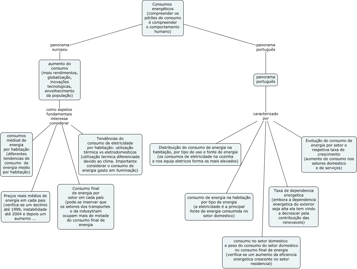 Esse mapa conceitual, produzido no IHMC CmapTools, tem a informação relacionada a: eficiência energetica_1, Consumos energéticos (compreender os pdrões de consumo é compreender o comportamento humano) panorama europeu aumento do consumo (mais rendimentos, globalização, inovações tecnologicas, envelhecimento da população), panorama português caracterizado por Evolução do consumo de energia por setor e respetiva taxa de crescimento (aumento do consumo nos setores domestico e de serviços), panorama português caracterizado por consumo de energia na habitação por tipo de energia (a eletricidade é a principal fonte de energia consumida no setor domestico), panorama português caracterizado por Distribuição do consumo de energia na habitação, por tipo de uso e fonte de energia (os consumos de eletricidade na cozinha e nos equip eletricos forma os mais elevados), aumento do consumo (mais rendimentos, globalização, inovações tecnologicas, envelhecimento da população) como aspetos fundamentais interessa considerar Tendências do consumo de eletricidade por habitação: utilização térmica vs eletrodomesticos (utilização termica diferenciada devido ao clima. Importante considerar o consumo de energia gasto em iluminação), aumento do consumo (mais rendimentos, globalização, inovações tecnologicas, envelhecimento da população) como aspetos fundamentais interessa considerar Preços reais médios de energia em cada pais (verifica-se um declinio até 1999, instabilidade até 2004 e depois um aumento ..., aumento do consumo (mais rendimentos, globalização, inovações tecnologicas, envelhecimento da população) como aspetos fundamentais interessa considerar Consumo final de energia por setor em cada país (pode.se inservar que os setores dos transportes e da indusytriam ocupam mais de metade do consumo final de energia, Consumos energéticos (compreender os pdrões de consumo é compreender o comportamento humano) panorama português panorama português, panorama português caracterizado por consumo no setor domestico e peso do consumo do setor domestico no consumo final de energia (verifica-se um aumento da eficiencia energetica crescente no setor residencial), panorama português caracterizado por Taxa de dependencia energetica (embora a dependencia energetica do exterior seja alta ela tem vindo a decrescer pela contribuição das renovaveis), aumento do consumo (mais rendimentos, globalização, inovações tecnologicas, envelhecimento da população) como aspetos fundamentais interessa considerar consumos médiod de energia por habitação (diferentes tendencias de consumo de energia medio por habitação)