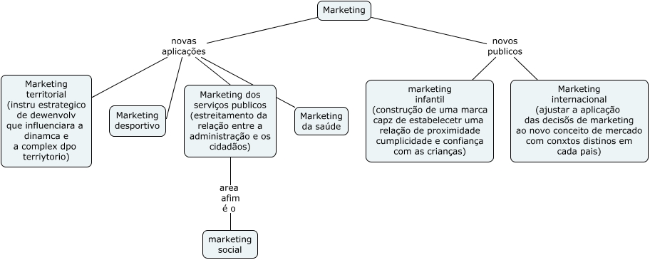 Esse mapa conceitual, produzido no IHMC CmapTools, tem a informação relacionada a: Marketing_horiz_1, Marketing novos publicos marketing infantil (construção de uma marca capz de estabelecetr uma relação de proximidade cumplicidade e confiança com as crianças), Marketing novas aplicações Marketing territorial (instru estrategico de dewenvolv que influenciara a dinamca e a complex dpo terriytorio), Marketing novas aplicações Marketing dos serviços publicos (estreitamento da relação entre a administração e os cidadãos), Marketing novas aplicações Marketing desportivo, Marketing dos serviços publicos (estreitamento da relação entre a administração e os cidadãos) area afim é o marketing social, Marketing novos publicos Marketing internacional (ajustar a aplicação das decisõs de marketing ao novo conceito de mercado com conxtos distinos em cada pais), Marketing novas aplicações Marketing da saúde